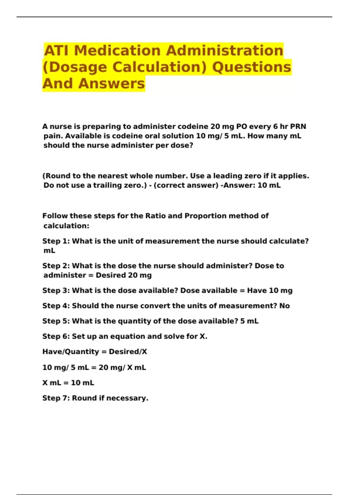 ATI Medication Administration (Dosage Calculation) Questions And Answers