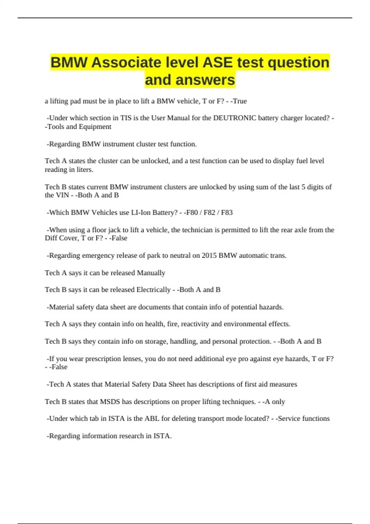 BMW Associate level ASE test question and answers