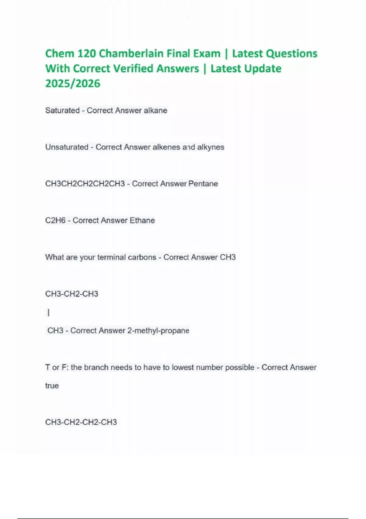 Chem 120 Chamberlain Final Exam | Latest Questions With Correct Verified Answers | Latest Update 2025/2026 Saturated - Correct Answer alkane Unsaturated - Correct Answer alkenes and alkynes CH3CH2CH2CH2CH3 - Correct Answer Pentane C2H6 - Correct Answer Ethane What are your terminal carbons - Correct Answer CH3 CH3-CH2-CH3 | CH3 - Correct Answer 2-methyl-propane T or F: the branch needs to have to lowest number possible - Correct Answer true CH3-CH2-CH2-CH3 | CH3 - Correct Answer 2-methyl- butane