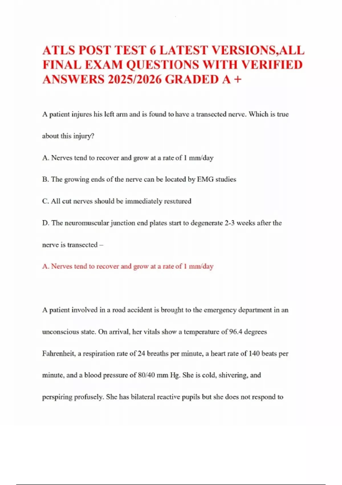 ATLS POST TEST 6 LATEST VERSIONS, ALL FINAL EXAM QUESTIONS WITH VERIFIED ANSWERS 2025/2026 GRADED A + A patient injures his left arm and is found to have a transected nerve. Which is true about this injury? A. Nerves tend to recover and grow at a rate of 1 mm/day B. The growing ends of the nerve can be located by EMG studies C. All cut nerves should be immediately resutured D. The neuromuscular junction end plates start to degenerate 2-3 weeks after the nerve is transected – A. Nerves tend to recover and grow at a rate of 1 mm/day A patient involved in a road accident is brought to the emergency department in an unconscious state. On arrival, her vitals show a temperature of 96.4 degrees Fahrenheit, a respiration rate of 24 breaths per minute, a heart rate of 140 beats per minute, and a blood pressure of 80/40 mm Hg. She is cold, shivering, and perspiring profusely. She has bilateral reactive pupils but she does not respond to pain. On physical examination, she has no obvious sign of external bleeding. Which of the following cannot be the cause of hypotension in this patient? A. Pelvic fracture