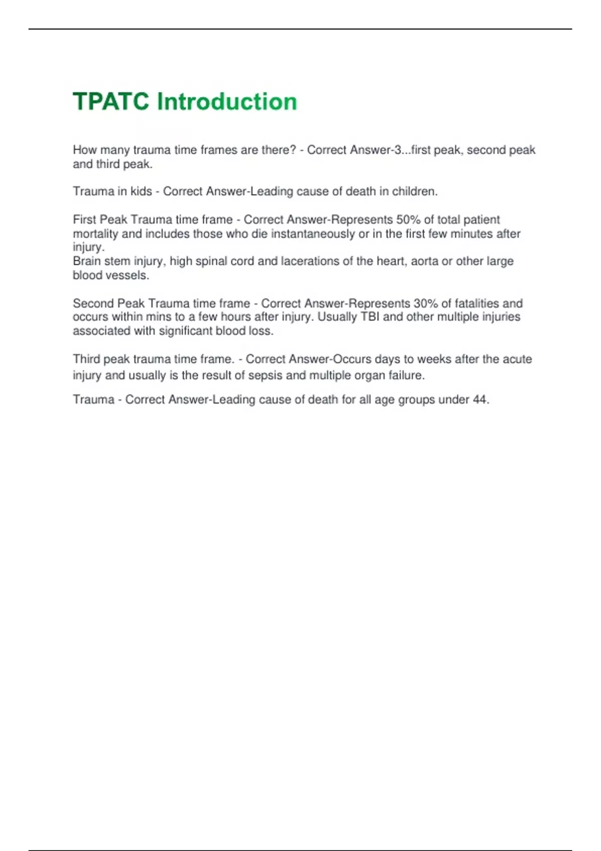 How many trauma time frames are there? - Correct Answer-3...first peak, second peak and third peak. Trauma in kids - Correct Answer-Leading cause of death in children. First Peak Trauma time frame - Correct Answer-Represents 50% of total patient mortality and includes those who die instantaneously or in the first few minutes after injury. Brain stem injury, high spinal cord and lacerations of the heart, aorta or other large blood vessels. Second Peak Trauma time frame - Correct Answer-Represents 30% of fatalities and occurs within mins to a few hours after injury. Usually TBI and other multiple injuries associated with significant blood loss
