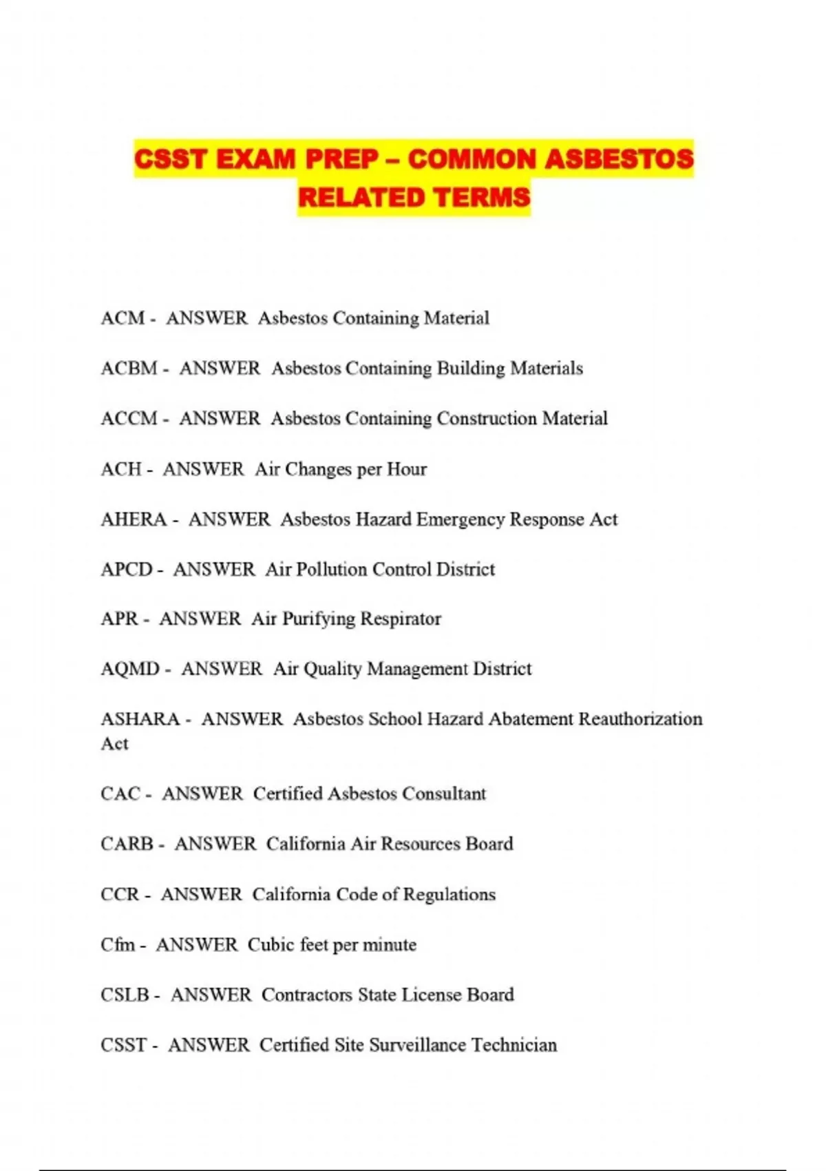 CSST EXAM PREP – COMMON ASBESTOS RELATED TERMS