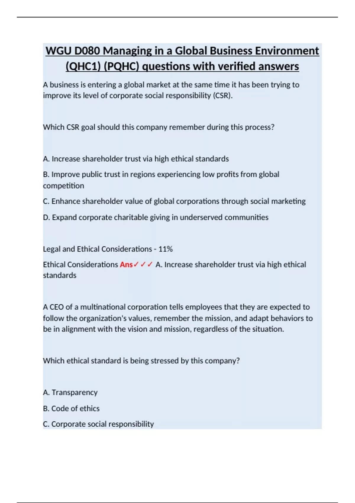 Ethical Considerations Ans✓✓✓ A. Increase shareholder trust via high ethical