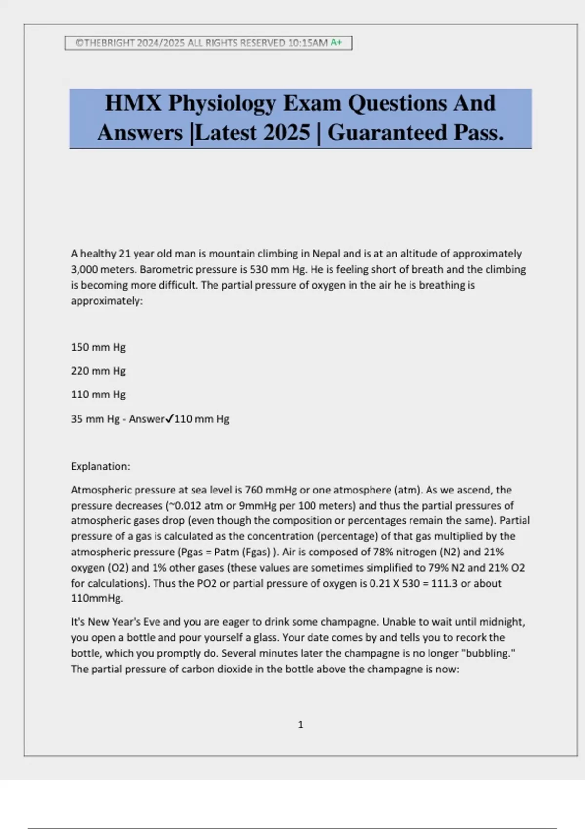 ©THEBRIGHT 2024/2025 ALL RIGHTS RESERVED 10:15AM A+ 1 HMX Physiology Exam Questions And Answers |Latest 2025 | Guaranteed Pass. A healthy 21 year old man is mountain climbing in Nepal and is at an altitude of approximately 3,000 meters. Barometric pressure is 530 mm Hg. He is feeling short of breath and the climbing is becoming more difficult. The partial pressure of oxygen in the air he is breathing is approximately: 150 mm Hg 220 mm Hg 110 mm Hg 35 mm Hg - Answer110 mm Hg Explanation: Atmospheric pressure at sea level is 760 mmHg or one atmosphere (atm). As we ascend, the pressure decreases (~0.012 atm or 9mmHg per 100 meters) and thus the partial pressures of atmospheric gases drop (even though the composition or percentages remain the same). Partial pressure of a gas is calculated as the concentration (percentage) of that gas multiplied by the atmospheric pressure (Pgas = Patm (Fgas) ). Air is composed of 78% nitrogen (N2) and 21% oxygen (O2) and 1% other gases (these values are sometimes simplified to 79% N2 and 21% O2 for calculations). Thus the PO2 or partial pressure of oxygen is 0.21 X 530 = 111.3 or about 110mmHg. It's New Year's Eve and you are eager to drink some champagne. Unable to wait until midnight, you open a bottle and pour yourself a glass. Your date comes by and tells you to recork the bottle, which you promptly do. Several minutes later the champagne is no longer "bubbling." The partial pressure of carbon dioxide in the bottle above the champagne is now: ©THEBRIGHT 2024/2025 ALL RIGHTS RESERVED 10:15AM A+ 2 The same as in the partial pressure of CO2 in the atmosphere The same as the partial pressure of CO2 in the champagne Less than the partial - AnswerThe same as the partial pressure of CO2 in the champagne Explanation: Carbon dioxide (CO2) is dissolved in solution under high pressures as in a champagne bottle. When the cork is removed the high pressure in the bottle begins to equalize with atmospheric pressure outside the bottle. As the pressure rapidly decreases in the bottle, CO2 begins to come out of solution and is represented as bubbles. When the cork is reinserted into the bottle, CO2 coming out of solution begins to accumulate as a gas in the bottle and the PCO2 in the gaseous state increases. When the bubbling ceases, the partial pressure of CO2 in the gaseous state in the bottle equals the PCO2 dissolved in the liquid (champagne). Consequently, the PCO2 in the bottle is greater than the PCO2 in the atmosphere (where it is essentially zero). We cannot know with certainty how much greater the PCO2 is in the gaseous phase in the bottle compared to the atmosphere. Imagine you are on the planet Venus where the atmospheric pressure is ~92 atm (1 atm = 760 mmHg). What are the partial pressures of the component atmospheric gases, given gas fractions of 96.5% CO2 and 3.5% N2? PCO2 96.5 atm; PN2 3.5 atm PCO2 88.8 atm; PN2 3.2 atm PCO2 0 atm; PN2 78 atm PCO2 73.3 atm; PN2 26.6 atm - AnswerPCO2 88.8 atm; PN2 3.2 atm Explanation: Partial pressure of a gas is calculated as the concentration (percentage) of that gas multiplied by the atmospheric pressure (Pgas = Patm (Fgas)). For CO2 on Venus, the calculation would be PCO2 = 0.965 X 92 = 88.8 atm; for N2, PN2 =.035 X 92 = 3.2 atm. The partial pressures of the component gases added together equals the total pressure in the system, in this case 92 atm. Joe and John are identical twins. John had a bleeding ulcer last week and is anemic with a hemoglobin level of 10 grams/100 ml of blood; Joe has a hemoglobin level of 14 grams/100 ml of blood (normal range is 13.5-17 grams/100 ml). Both are completely healthy, with the exception of John's recent ulcer. The partial pressure of oxygen in the twin's blood is: ©THEBRIGHT 2024/2025 ALL RIGHTS RESERVED 10:15AM A+ 3 The same Higher in Joe than John Higher in John than Joe You need more information to make the determination. - AnswerThe same Hemoglobin is a protein carried in the blood that is responsible for the large oxygen carrying capacity of the blood. As oxygen enters the blood some is carried on hemoglobin and some is dissolved in "solution" or the plasma component of blood. Partial pressure only measures dissolved oxygen in the bloodstream, not oxygen bound to hemoglobin. When we measure hemoglobin in blood it is measured as grams of the protein per 100 milliliters of blood volume. This question drives at the difference between oxygen content (i.e. dissolved oxygen + oxygen bound to hemoglobin) and partial pressure of oxygen (i.e. reflective of dissolved oxygen only). Partial pressure of oxygen in the blood is independent of the hemoglobin or oxygen carrying capacity of the blood. Thus regardless of the amount of hemoglobin in the blood the partial pressure of oxygen is the same between the twins. Carbon monoxide, a product of combustion, is a toxic gas that has an extremely high affinity for hemoglobin (much higher than that of oxygen for hemoglobin); consequently, as soon as it dissolves in the liquid part of blood at low partial pressure, it diffuses quickly into red blood cells and binds to hemoglobin. In carbon monoxide (CO) poisoning, even with very low partial pressure of inspired CO, CO rapidly binds to hemoglobin (Hgb), leaving a lower fraction of oxygen binding sites on Hgb avai - AnswerNormal PO2 Explanation: The person's arterial PO2 is likely to be normal. Remember that the O2 content of the blood consists of dissolved O2 and O2 bound to Hgb. The partial pressure of O2 in the blood is determined by the O2 dissolved in the liquid portion of the blood and does not depend on the amount of Hgb or the availability of oxygen binding sites on Hgb. The partial pressure of inspired CO is usually low in CO poisoning and does not change the PO2 in the inspired air; therefore, oxygen will reach the same equilibrium between its gaseous state in the alveolus and its dissolved state in the alveolar capillary blood during carbon monoxide poisoning. However, oxygen content (