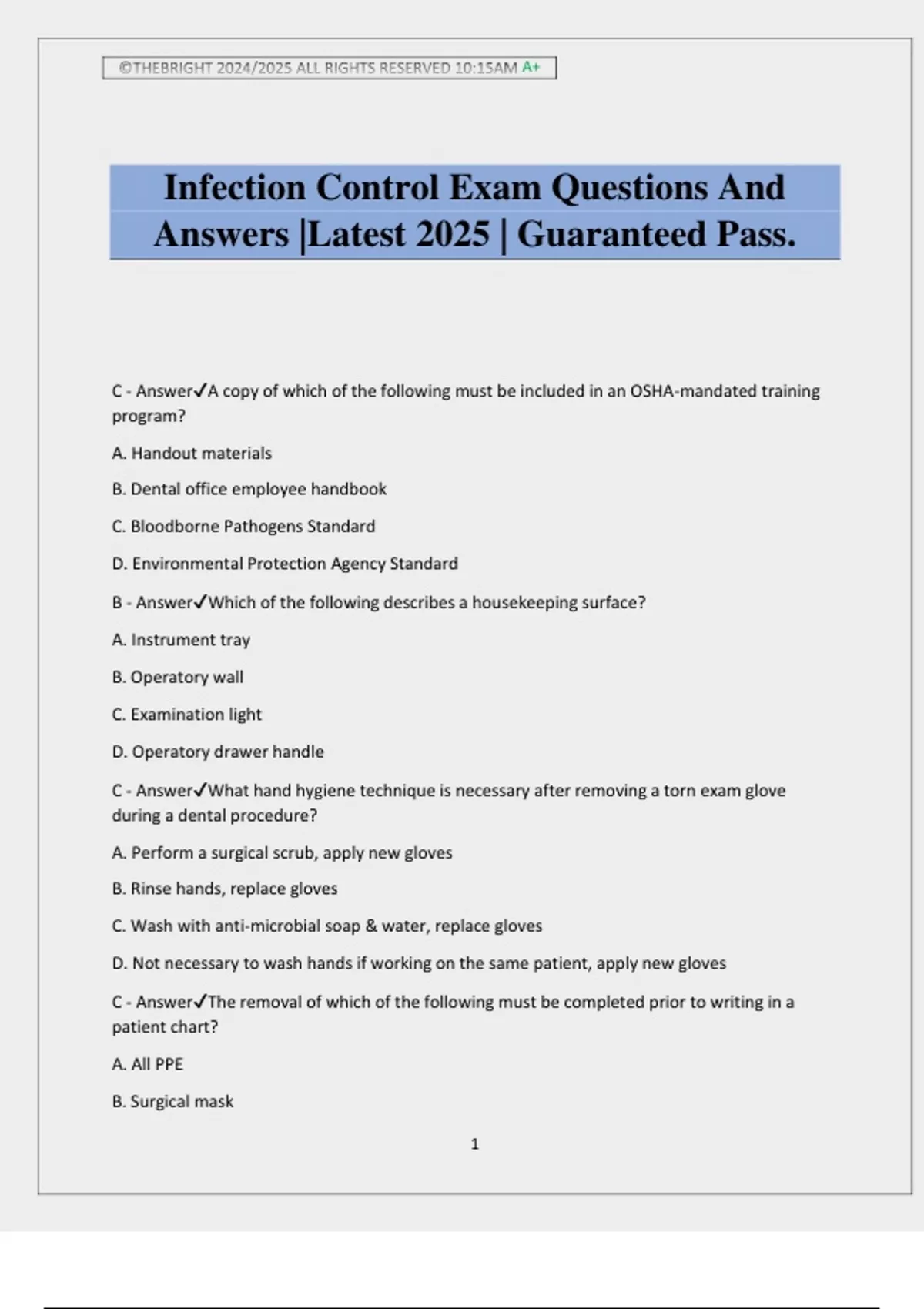 ©THEBRIGHT 2024/2025 ALL RIGHTS RESERVED 10:15AM A+ 1 Infection Control Exam Questions And Answers |Latest 2025 | Guaranteed Pass. C - AnswerA copy of which of the following must be included in an OSHA-mandated training program? A. Handout materials B. Dental office employee handbook C. Bloodborne Pathogens Standard D. Environmental Protection Agency Standard B - AnswerWhich of the following describes a housekeeping surface? A. Instrument tray B. Operatory wall C. Examination light D. Operatory drawer handle C - AnswerWhat hand hygiene technique is necessary after removing a torn exam glove during a dental procedure? A. Perform a surgical scrub, apply new gloves B. Rinse hands, replace gloves C. Wash with anti-microbial soap & water, replace gloves D. Not necessary to wash hands if working on the same patient, apply new gloves C - AnswerThe removal of which of the following must be completed prior to writing in a patient chart? A. All PPE B. Surgical mask ©THEBRIGHT 2024/2025 ALL RIGHTS RESERVED 10:15AM A+ 2 C. Exam gloves D. Surface barriers B - AnswerWhich of the following is true for people who are hepatitis B surface-antibody- positive? A. They require vaccination for hepatitis B B. They cannot contract or transmit hepatitis B C. They can contract but cannot transmit hepatitis B D. They have had signs or symptoms of hepatitis B infection D - AnswerPrior to assisting with an intra-oral exam, what PPE equipment is put on FIRST? A. Mask B. Gloves C. Protective eyewear D. Protective clothing C - AnswerWhich of the following is NOT a link in the chain of infection A. Portal of entry B. Mode of transmission C. Spread of contamination D. Reservoir for the pathogen A - AnswerAccording to the OSHA Bloodborne Pathogens Standard, which of the following is prohibited in dental treatment areas? A. Eating & drinking B. Applying antiseptic hand lotion C. Talking on the phone & taking notes D. Removing all personal protective equipment B - AnswerWhich of the following should