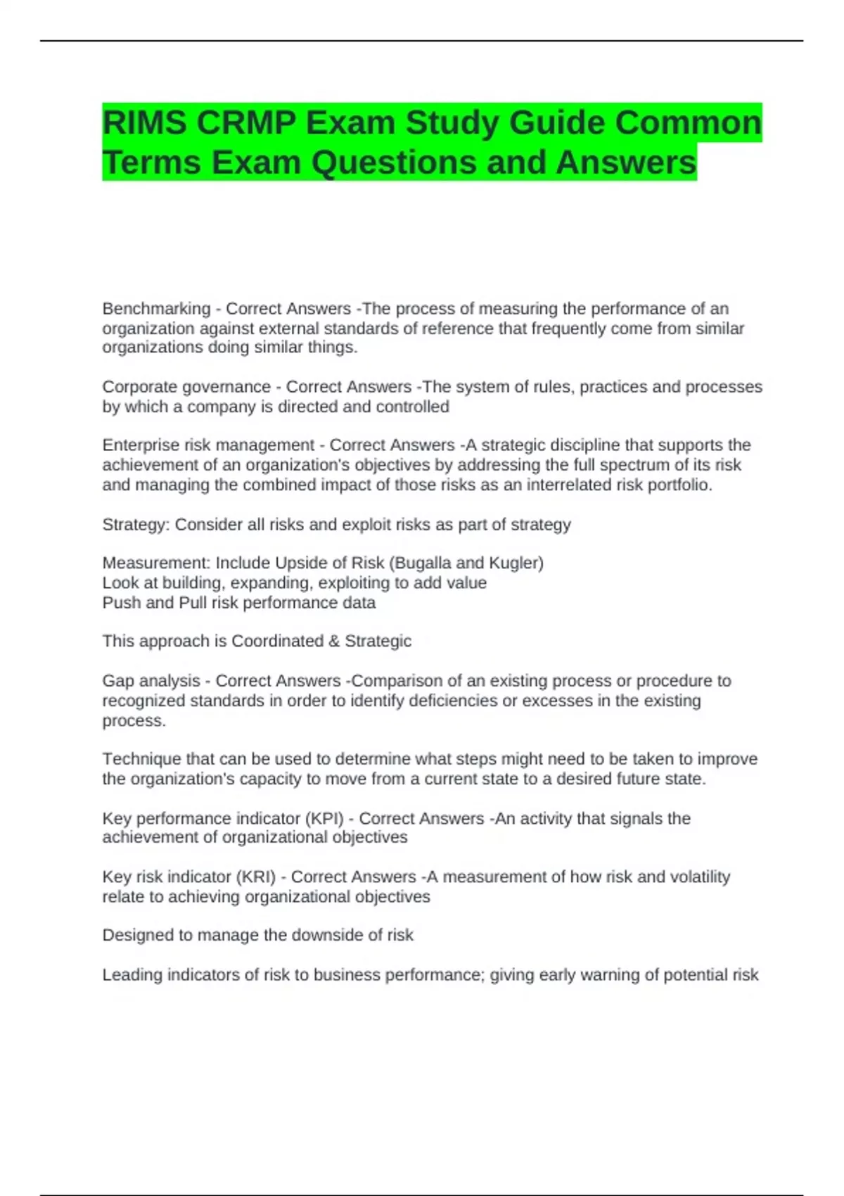 RIMS CRMP Exam Study Guide Common Terms Exam Questions and Answers