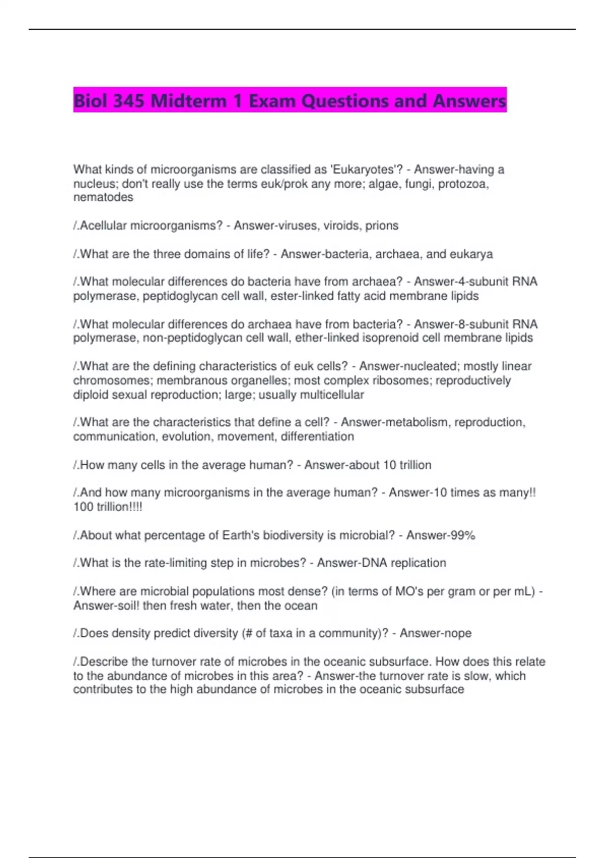 Biol 345 Midterm 1 Exam Questions and Answers What kinds of microorganisms are classified as 'Eukaryotes'? - Answer-having a nucleus; don't really use the terms euk/prok any more; algae, fungi, protozoa, nematodes /.Acellular microorganisms? - Answer-viruses, viroids, prions /.What are the three domains of life? - Answer-bacteria, archaea, and eukarya /.What molecular differences do bacteria have from archaea? - Answer-4-subunit RNA polymerase, peptidoglycan cell wall, ester-linked fatty acid membrane lipids /.What molecular differences do archaea have from bacteria? - Answer-8-subunit RNA polymerase, non-peptidoglycan cell wall, ether-linked isoprenoid cell membrane lipids /.What are the defining characteristics of euk cells? - Answer-nucleated; mostly linear chromosomes; membranous organelles; most complex ribosomes; reproductively diploid sexual reproduction; large; usually multicellular /.What are the characteristics that define a cell? - Answer-metabolism, reproduction, communication, evolution, movement, differentiation /.How many cells in the average human? - Answer-about 10 trillion /.And how many microorganisms in the average human? - Answer-10 times as many!! 100 trillion!!!! /.About what percentage of Earth's biodiversity is microbial? - Answer-99% /.What is the rate-limiting step in microbes? - Answer-DNA replication /.Where are microbial populations most dense? (in terms of MO's per gram or per mL) - Answer-soil! then fresh water, then the ocean /.Does density predict diversity (# of taxa in a community)? - Answer-nope /.Describe the turnover rate of microbes in the oceanic subsurface. How does this relate to the abundance of microbes in this area? - Answer-the turnover rate is slow, which contributes to the high abundance of microbes in the oceanic subsurface /.What is known about the oceanic subsurface in relation to nitrogen and phosphorous? - Answer-oceanic subsurface is a huge N and P reservoir /.How do bacteria compare to plants in C, N, and P? - Answer-bacteria contain 60-100% of the cellular carbon of all plants and about 10x the N and P of all plants! /.What are the 4 "ages" of microbio history? - Answer-the age of sanitation (pre-1660's), the age of discovery (1660's-1850's), the age of diagnoses (1850's-1920's), and the age of biotechnology (1920's-present) /.Robert Hooke - Answer-first person to see MOs under a microscope; saw cell structure of plants of fungi, but his lenses were too poor to see bacteria /.Francesco Redi - Answer-first to seriously argue against "spontaneous generation"; experiment proved maggots are not spontaneously generated in rotten meat /.Anton van Leeuwenhoek - Answer-first to see and describe bacteria and characteristic morphology; drawings of "wee animalcules"; originally drove development of microscope b/c of thread counting for fabric /.Edward Jenner - Answer-introduces concept of vaccination using cowpox material to prevent small pox /.Ignaz Semmelweis - Answer-reduces infant mortality in hospitals (wash your hands before delivering a baby!); no germ theory yet /.what is variolation? - Answer-scraped off some cowpox and put it on patient to provide immunity to to stronger strain of disease (small pox) /.Louis Pasteur - Answer-settles question of spontaneous generation with swan necked flask experiments; Germ Theory; contributed to development of vaccinations for the immunization against rabies, anthrax, and chicken cholera; fermentation; pastuerization /.What is the germ theory? - Answer-aka cell theory; microbiology becomes a discipline; MOs known to have same fundamental properties as other living organisms /.What is pasteurization? - Answer-heat food then let it cool down before canning it; originally used for canned food for Napoleon's armies /.Joseph Lister - Answer-introduced antiseptic methods to medicine; introduced practices to limit exposure of infections MOs during surgery /.Robert Koch - Answer-established relationship between MOs and infectious disease; Koch's postulates; discovered causative agent for anthrax, tuberculosis, and cholera; contributed to Germ Theory