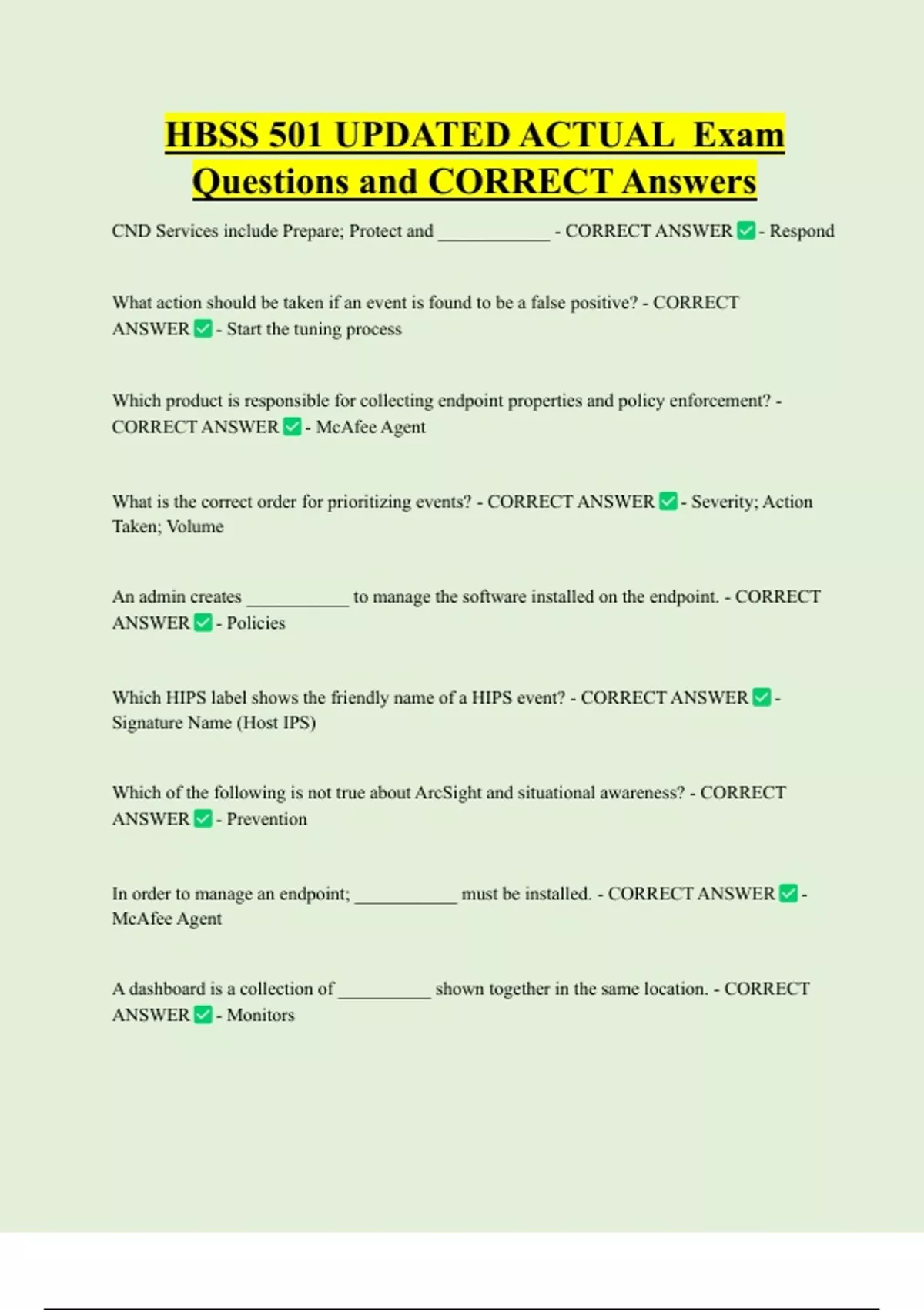 HBSS 501 UPDATED ACTUAL Exam Questions and CORRECT Answers CND Services include Prepare; Protect and ____________ - CORRECT ANSWER - Respond What action should be taken if an event is found to be a false positive? - CORRECT ANSWER - Start the tuning process Which product is responsible for collecting endpoint properties and policy enforcement? - CORRECT ANSWER - McAfee Agent