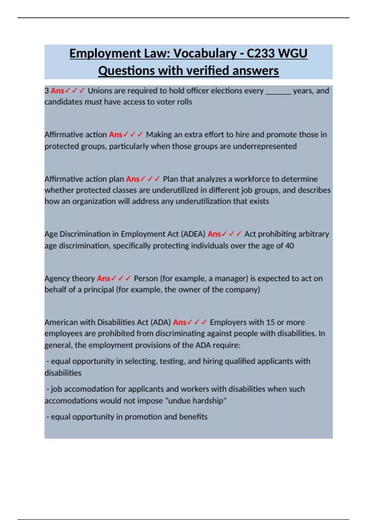 Employment Law: Vocabulary - C233 WGU Questions with verified answers