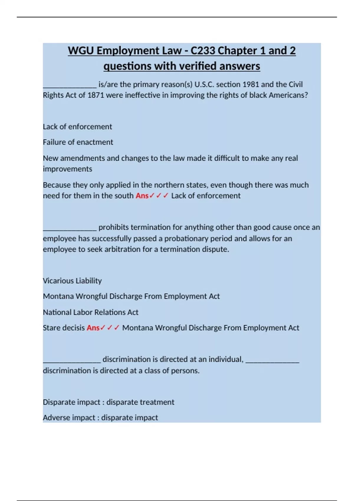 _____________ is/are the primary reason(s) U.S.C. section 1981 and the Civil Rights Act of 1871 were ineffective in improving the rights of black Americans? Lack of enforcement Failure of enactment New amendments and changes to the law made it difficult to make any real improvements Because they only applied in the northern states, even though there was much need for them in the south Ans Lack of enforcement _____________ prohibits termination for anything other than good cause once an employee has successfully passed a probationary period and allows for an employee to seek arbitration for a termination dispute. Vicarious Liability Montana Wrongful Discharge From Employment Act National Labor Relations Act Stare decisis Ans Montana Wrongful Discharge From Employment Act