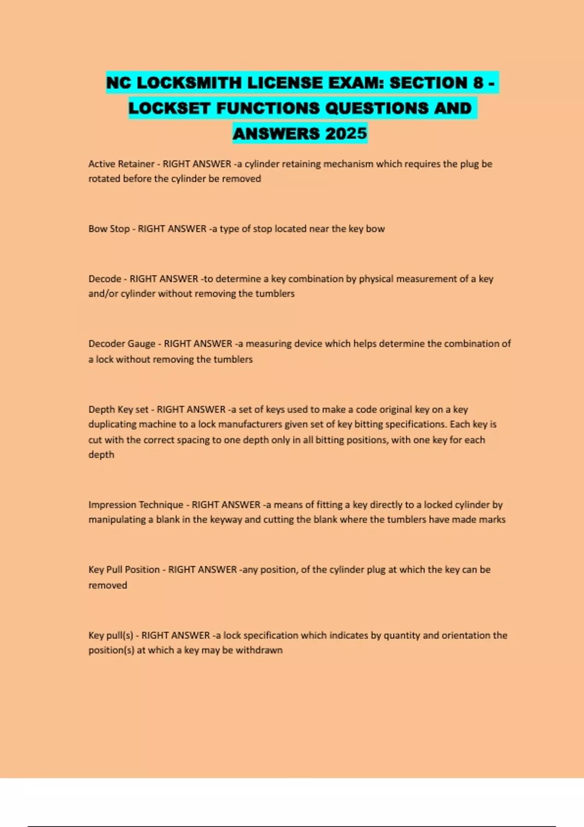NC LOCKSMITH LICENSE EXAM: SECTION 8 - LOCKSET FUNCTIONS QUESTIONS AND ANSWERS 2025 Active Retainer - RIGHT ANSWER -a cylinder retaining mechanism which requires the plug be rotated before the cylinder be removed Bow Stop - RIGHT ANSWER -a type of stop located near the key bow Decode - RIGHT ANSWER -to determine a key combination by physical measurement of a key and/or cylinder without removing the tumblers Decoder Gauge - RIGHT ANSWER -a measuring device which helps determine the combination of a lock without removing the tumblers Depth Key set - RIGHT ANSWER -a set of keys used to make a code original key on a key duplicating machine to a lock manufacturers given set of key bitting specifications. Each key is cut with the correct spacing to one depth only in all bitting positions, with one key for each depth Impression Technique - RIGHT ANSWER -a means of fitting a key directly to a locked cylinder by manipulating a blank in the keyway and cutting the blank where the tumblers have made marks Key Pull Position - RIGHT ANSWER -any position, of the cylinder plug at which the key can be removed Key pull(s) - RIGHT ANSWER -a lock specification which indicates by quantity and orientation the position(s) at which a key may be withdrawn Primary Key - RIGHT ANSWER -a key, which operates the ignition lock on a vehicle. It may or may not also operate some or all the other locks on the vehicle Progression - RIGHT ANSWER -a logical sequence of selecting possible key bittings, usually in numerical order from the key bitting array Resistor Pellet - RIGHT ANSWER -the encapsulated resistor with exposed contacts installed in a key, such as that for VATS Secondary key - RIGHT ANSWER -a key which operates certain locks on a vehicle, but not the ignition lock Tip Stop - RIGHT ANSWER -a type of stop located near the tip of the key Try-out key - RIGHT ANSWER -a manipulation key which is usually part of a set, used for a specific series, keyway, and/or brand of lock Valet Key - RIGHT ANSWER -an automotive key that operates all locks except storage compartments, on a vehicle where there is also a master key to operate all locksd VATS - RIGHT ANSWER -Vehicle Anti-Theft System Vehicle Anti-Theft System - RIGHT ANSWER -an electronic system in some General Motors vehicles which uses a resistor pellet of varying value imbedded in a mechanical ignition key