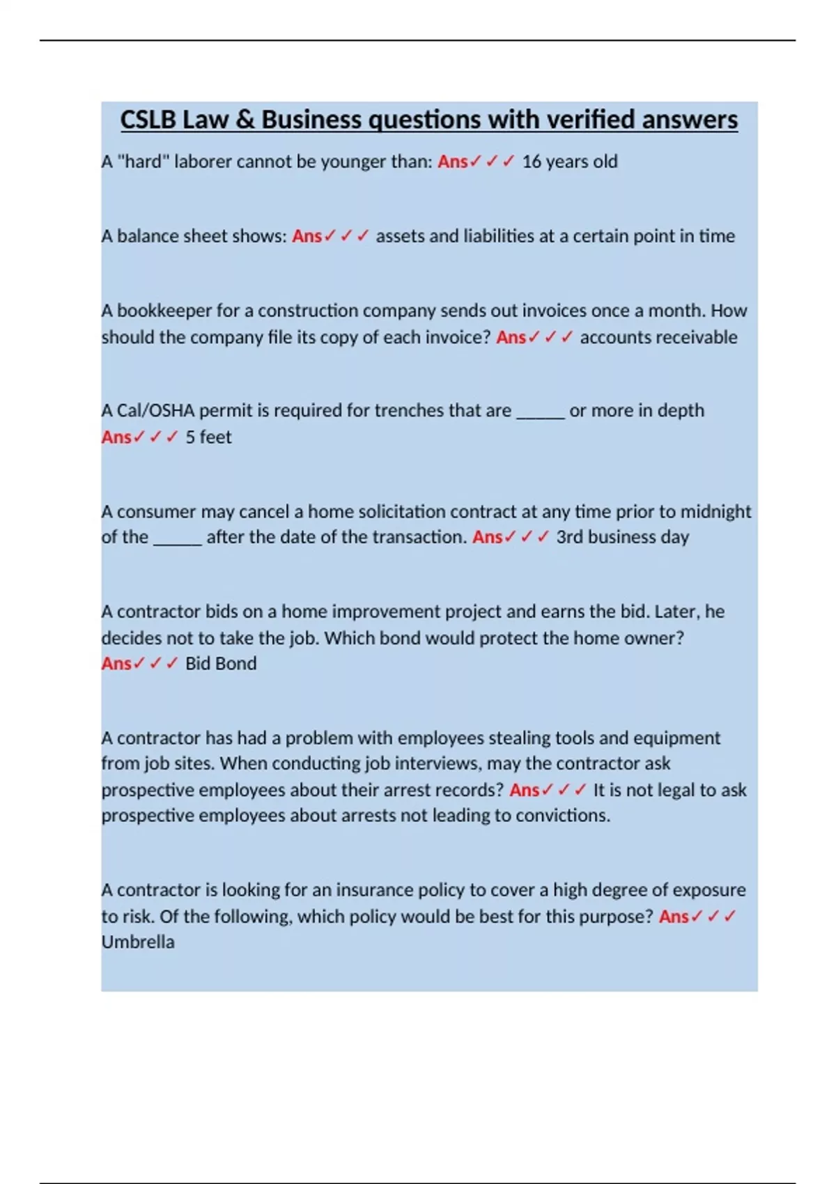 A "hard" laborer cannot be younger than: Ans 16 years old A balance sheet shows: Ans assets and liabilities at a certain point in time A bookkeeper for a construction company sends out invoices once a month. How should the company file its copy of each invoice? Ans accounts receivable A Cal/OSHA permit is required for trenches that are _____ or more in depth Ans 5 feet A consumer may cancel a home solicitation contract at any time prior to midnight of the _____ after the date of the transaction. Ans 3rd business day A contractor bids on a home improvement project and earns the bid. Later, he decides not to take the job. Which bond would protect the home owner? Ans Bid Bond A contractor has had a problem with employees stealing tools and equipment from job sites. When conducting job interviews, may the contractor ask prospective employees about their arrest records? Ans It is not legal to ask prospective employees about arrests not leading to convictions.