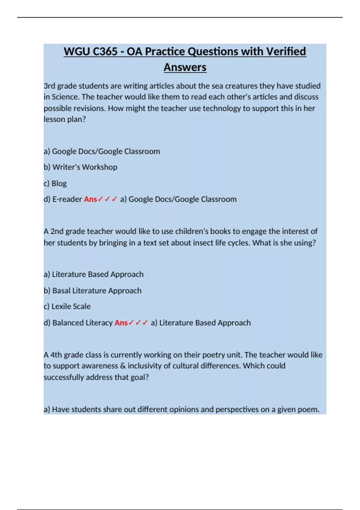 3rd grade students are writing articles about the sea creatures they have studied in Science. The teacher would like them to read each other's articles and discuss possible revisions. How might the teacher use technology to support this in her lesson plan? a) Google Docs/Google Classroom b) Writer's Workshop c) Blog d) E-reader Ans a) Google Docs/Google Classroom A 2nd grade teacher would like to use children's books to engage the interest of her students by bringing in a text set about insect life cycles. What is she using? a) Literature Based Approach b) Basal Literature Approach c) Lexile Scale d) Balanced Literacy Ans a) Literature Based Approach A 4th grade class is currently working on their poetry unit. The teacher would like to support awareness & inclusivity of cultural differences. Which could successfully address that goal? a) Have students share out different opi