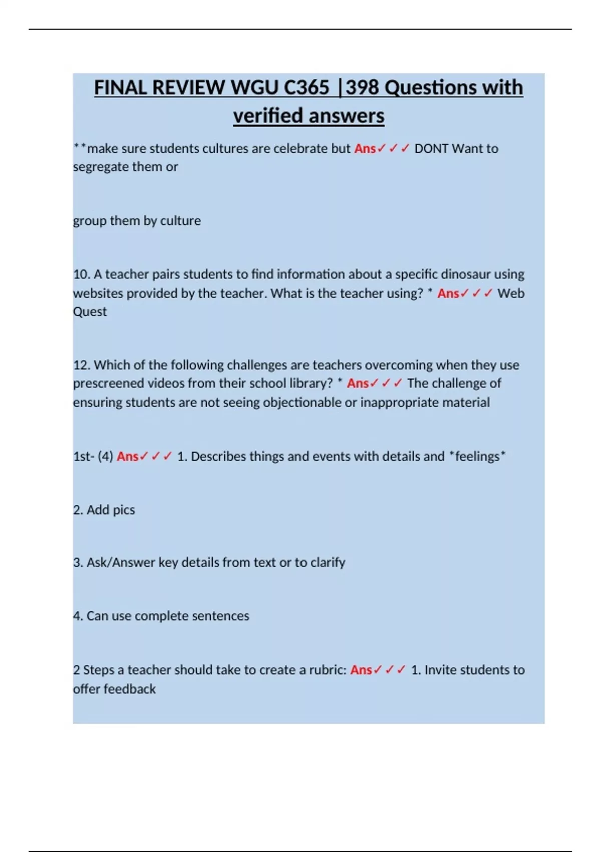 **make sure students cultures are celebrate but Ans DONT Want to segregate them or group them by culture 10. A teacher pairs students to find information about a specific dinosaur using websites provided by the teacher. What is the teacher using? * Ans Web Quest 12. Which of the following challenges are teachers overcoming when they use prescreened videos from their school library? * Ans The challenge of ensuring students are not seeing objectionable or inappropriate material 1st- (4) Ans 1. Describes things and events with details and *feelings* 2. Add pics 3. Ask/Answer key details from text or to clarify 4. Can use complete sentences 2 Steps a teacher should take to create a rubric: Ans 1. Invite students to offer feedback