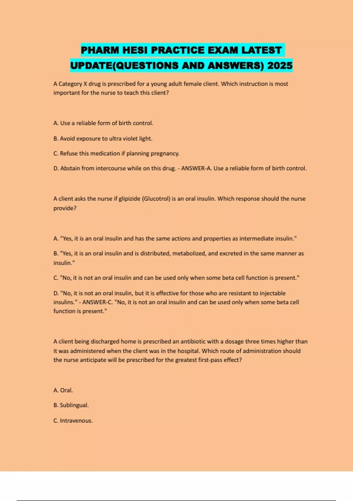PHARM HESI PRACTICE EXAM LATEST UPDATE(QUESTIONS AND ANSWERS) 2025 A Category X drug is prescribed for a young adult female client. Which instruction is most important for the nurse to teach this client? A. Use a reliable form of birth control. B. Avoid exposure to ultra violet light. C. Refuse this medication if planning pregnancy. D. Abstain from intercourse while on this drug. - ANSWER-A. Use a reliable form of birth control. A client asks the nurse if glipizide (Glucotrol) is an oral insulin. Which response should the nurse provide? A. "Yes, it is an oral insulin and has the same actions and properties as intermediate insulin." B. "Yes, it is an oral insulin and is distributed, metabolized, and excreted in the same manner as insulin." C. "No, it is not an oral insulin and can be used only when some beta cell function is present." D. "No, it is not an oral insulin, but it is effective for those who are resistant to injectable insulins." - ANSWER-C. "No, it is not an oral insulin and can be used only when some beta cell function is present." A client being discharged home is prescribed an antibiotic with a dosage three times higher than it was administered when the client was in the hospital. Which route of administration should the nurse anticipate will be prescribed for the greatest first-pass effect? A. Oral. B. Sublingual. C. Intravenous. D. Subcutaneous. - ANSWER-A. Oral. A client being discharged is prescribed warfarin for the treatment following a pulmonary embolism. Which diagnostic test should the nurse instruct the client to receive once a month? A. Perfusion scan. B. Prothrombin Time (PT). C. Activated partial thromboplastin (aPTT). D. Serum Coumadin level (SCL). - ANSWER-B. Prothrombin Time (PT). A client being treated for hyperthyroidism with propylthiouracil (PTU) asks the nurse how the medication works. Which is the best response to give the client? A. It decreases the amount of thyroid-stimulating hormone circulating in the blood. B. It increases the amount of thyroid-stimulating hormone circulating in the blood. C. It enhances the amount of T4 and diminishes the amount of T3 produced by the thyroid. D. It inhibits the synthesis of T3 and T4 by the thyroid gland. - ANSWER-D. It inhibits the synthesis of T3 and T4 by the thyroid gland. A client has a continuous IV infusion of dopamine (Intropin) and an IV of normal saline at 50 mL/hour. The nurse notes that the client's urinary output has been 20 mL/hour for the last 2 hours. Which intervention should the nurse initiate? A. Stop the infusion of dopamine. B. Change the normal saline to a keep open rate. C. Replace the urinary catheter. D. Notify the healthcare provider of the urinary output. - ANSWER-D. Notify the healthcare provider of the urinary output. A client is admitted to the hospital for a new onset of supraventricular tachycardia (SVT) and is prescribed digoxin. For which laboratory finding should the nurse notify the healthcare provider immediately? A. Potassium level of 3.1 mEq/L. B. Sodium level of 132 mEq/L. C. Calcium level of 8.6 mg/dL. D. Magnesium level of 1.2 mEq/L. - ANSWER-A. Potassium level of 3.1 mEq/L. A client is admitted to the hospital for diagnostic testing for possible myasthenia gravis. The nurse prepares for intravenous administration of edrophonium chloride (Tensilon). What is the expected outcome for this client following administration of this pharmacologic agent? A. Progressive difficulty with swallowing. B. Decreased respiratory effort. C. Improvement in generalized fatigue. D. Decreased muscle weakness. - ANSWER-D. Decreased muscle weakness. A client is being treated for osteoporosis with alendronate (Fosamax), and the nurse has completed discharge teaching regarding medication administration. Which morning schedule would indicate to the nurse that the client teaching has been effective? A. Take medication, go for a 30 minute morning walk, then eat breakfast. B. Take medication, rest in bed for 30 minutes, eat breakfast, go for morning walk. C. Take medication with breakfast, then take a 30 minute morning walk. D. Go for a 30 minute morning walk, eat breakfast, then take medication. - ANSWER-A. Take medication, go for a 30 minute morning walk, then eat breakfast. A client is experiencing anaphylaxis from an insect sting. Which medication should the nurse administer? A. Dopamine. B. Ephedrine. C. Epinephrine. D. Diphenhydramine. - ANSWER-C. Epinephrine. A client is prescribed 1 mcg/kg/min of dobutamine hydrochloride via IV infusion. Which client's condition would benefit the most from an administration of dobutamine hydrochloride? A. Shock. B. Asthma. C. Hypotension. D. Heart failure. - ANSWER-D. Heart failure. A client is prescribed aluminum hydroxide for peptic ulcer disease. Which statement by the client demonstrates an understanding of the action of the medication? A. It decreases the production of gastric secretions. B. It produces an adherent barrier over the ulcer. C. It helps maintain a gastric pH of 3.5 or above. D. It slows down the gastric motor activity. - ANSWER-C. It helps maintain a gastric pH of 3.5 or above. A client is prescribed ampicillin sodium (Omnipen) for a sinus infection. The nurse should instruct the client to notify the healthcare provider immediately if which symptom occurs? A. Rash. B. Nausea. C. Headache. D. Dizziness. - ANSWER-A. Rash. A client is prescribed controlled-release oxycodone. Which dosing schedule is best for the nurse to teach the client? A. As needed. B. Every 12 hours. C. Every 24 hours. D. Every 4 to 6 hours. - ANSWER-B. Every 12 hours. A client is prescribed morphine 1 mg IV per hour basal rate with 1 mg IV every 15 minutes per patient-controlled analgesia (PCA) pump for a total of 5 mg IV maximally per hour. Which nursing action has the highest priority before initiating the PCA pump? A. Assessment of the expiration date on the morphine syringe in the pump. B. Assessment of the rate and depth of the client's respirations. C. Assessment o