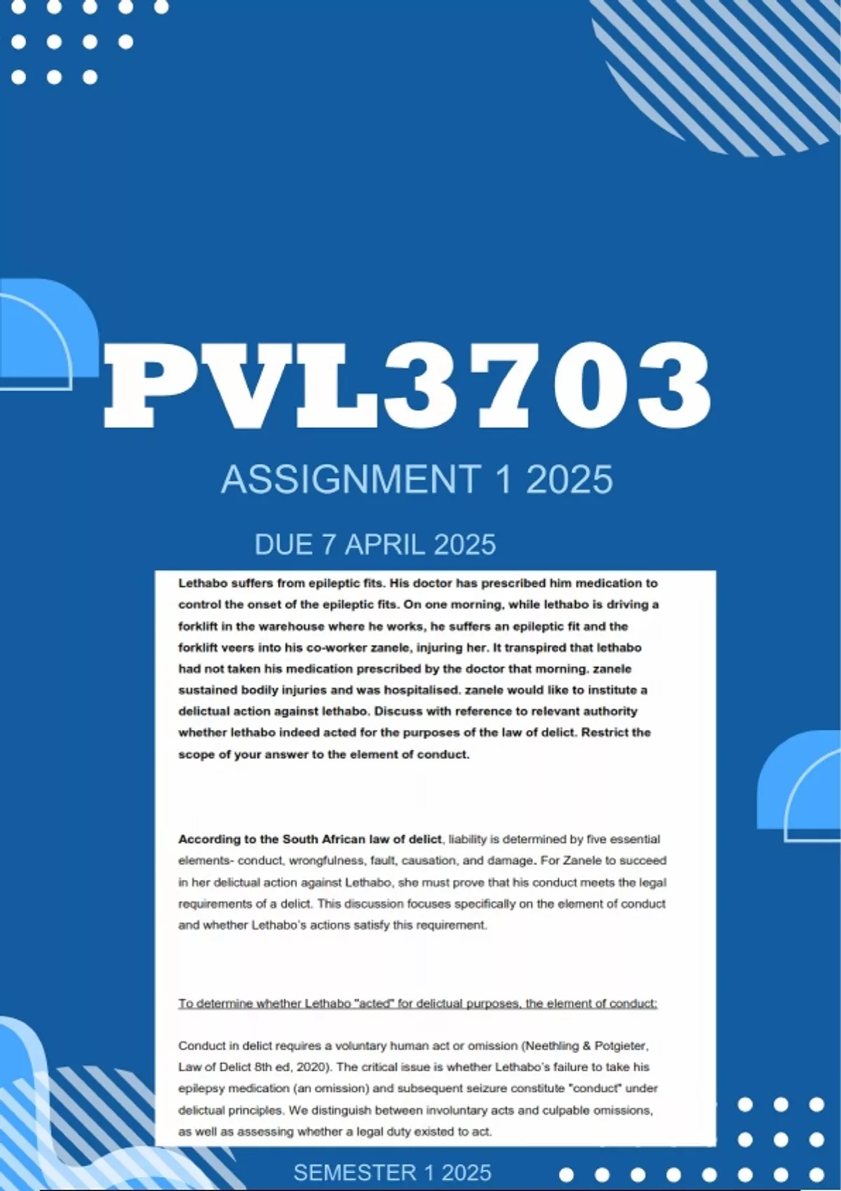 PVL3703 Law of delict Semester 1 of 2025 Assessment 1 Lethabo suffers from epileptic fits. His doctor has prescribed him medication to control the onset of the epileptic fits. On one morning, while lethabo is driving a forklift in the warehouse where he works, he suffers an epileptic fit and the forklift veers into his co-worker zanele, injuring her. It transpired that lethabo had not taken his medication prescribed by the doctor that morning. zanele sustained bodily injuries and was hospitalised. zanele would like to institute a delictual action against lethabo. Discuss with reference to relevant authority whether lethabo indeed acted for the purposes of the law of delict. Restrict the scope of your answer to the element of conduct. According to the South African law of delict, liability is determined by five essential elements- conduct, wrongfulness, fault, causation, and damage. For Zanele to succeed in her delictual action against Lethabo, she must prove that his conduct meets the legal requirements of a delict. This discussion focuses specifically on the element of conduct and whether Lethabo’s actions satisfy this requirement. To determine whether Lethabo "acted" for delictual purposes, the element of conduct: Conduct in delict requires a voluntary human act or omission (Neethling & Potgieter, Law of Delict 8th ed, 2020). The critical issue is whether Lethabo’s failure to take his epilepsy medication (an omission) and subsequent seizure constitute "conduct" under delictual principles. We distinguish between involuntary acts and culpable omissions, as well as assessing whether a legal duty existed to act.