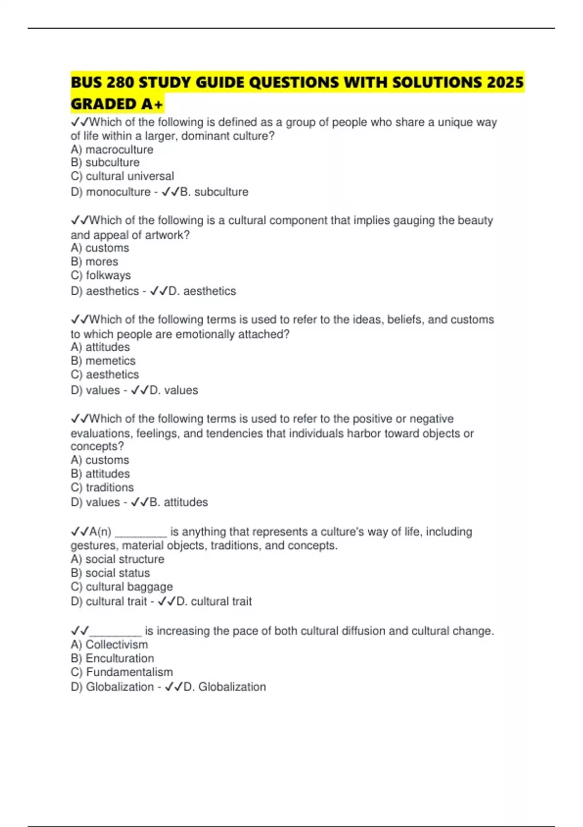 ✔✔Which of the following terms is used to refer to the ideas, beliefs, and customs