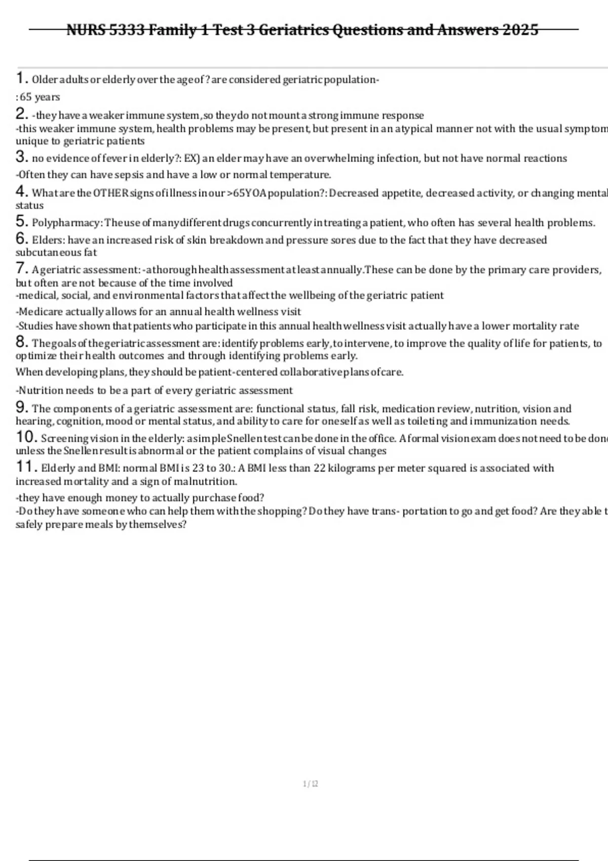, NURS 5333 Family 1 Test 3 Geriatrics Questions and Answers 2025