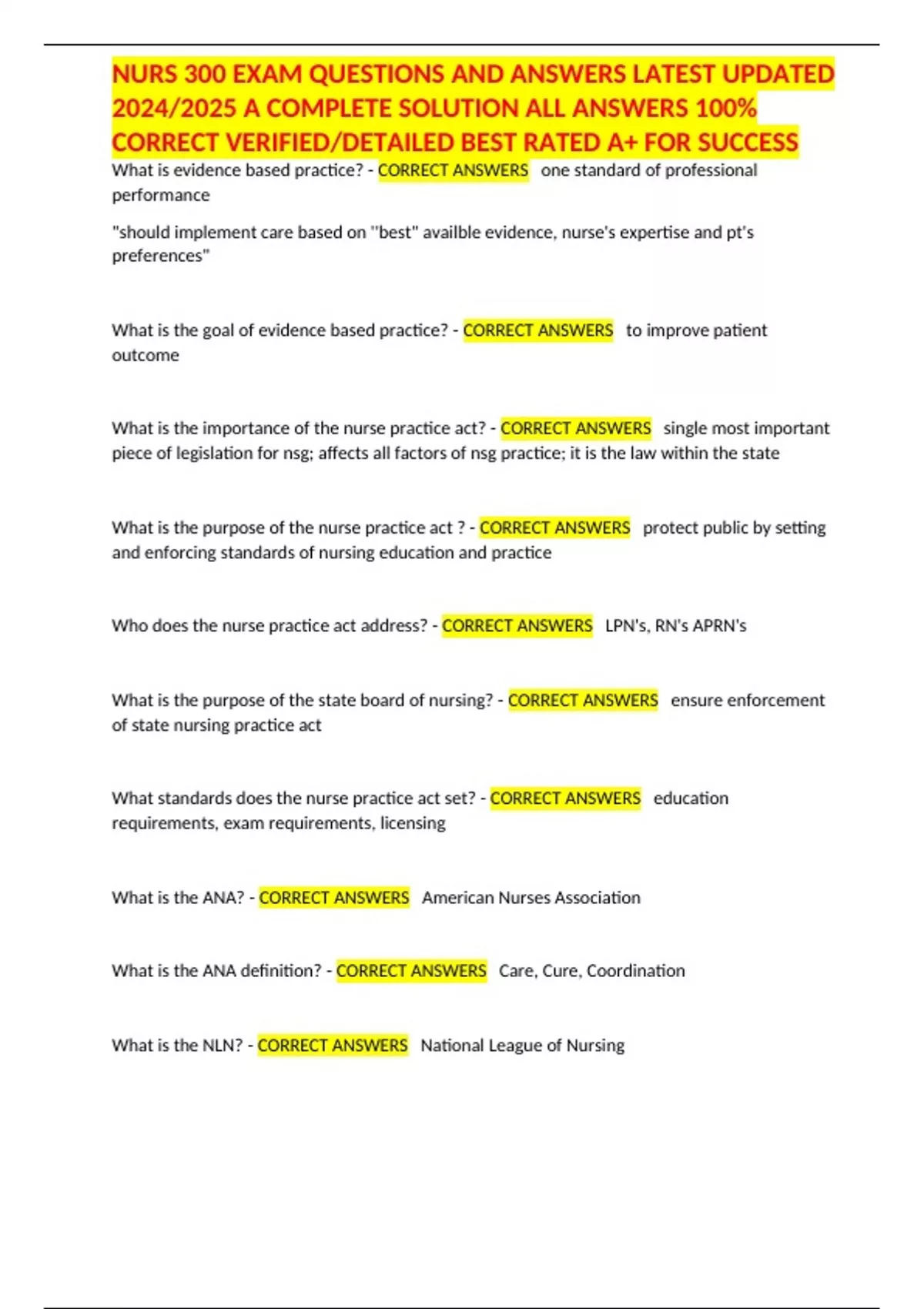 NURS 300 EXAM QUESTIONS AND ANSWERS LATEST UPDATED