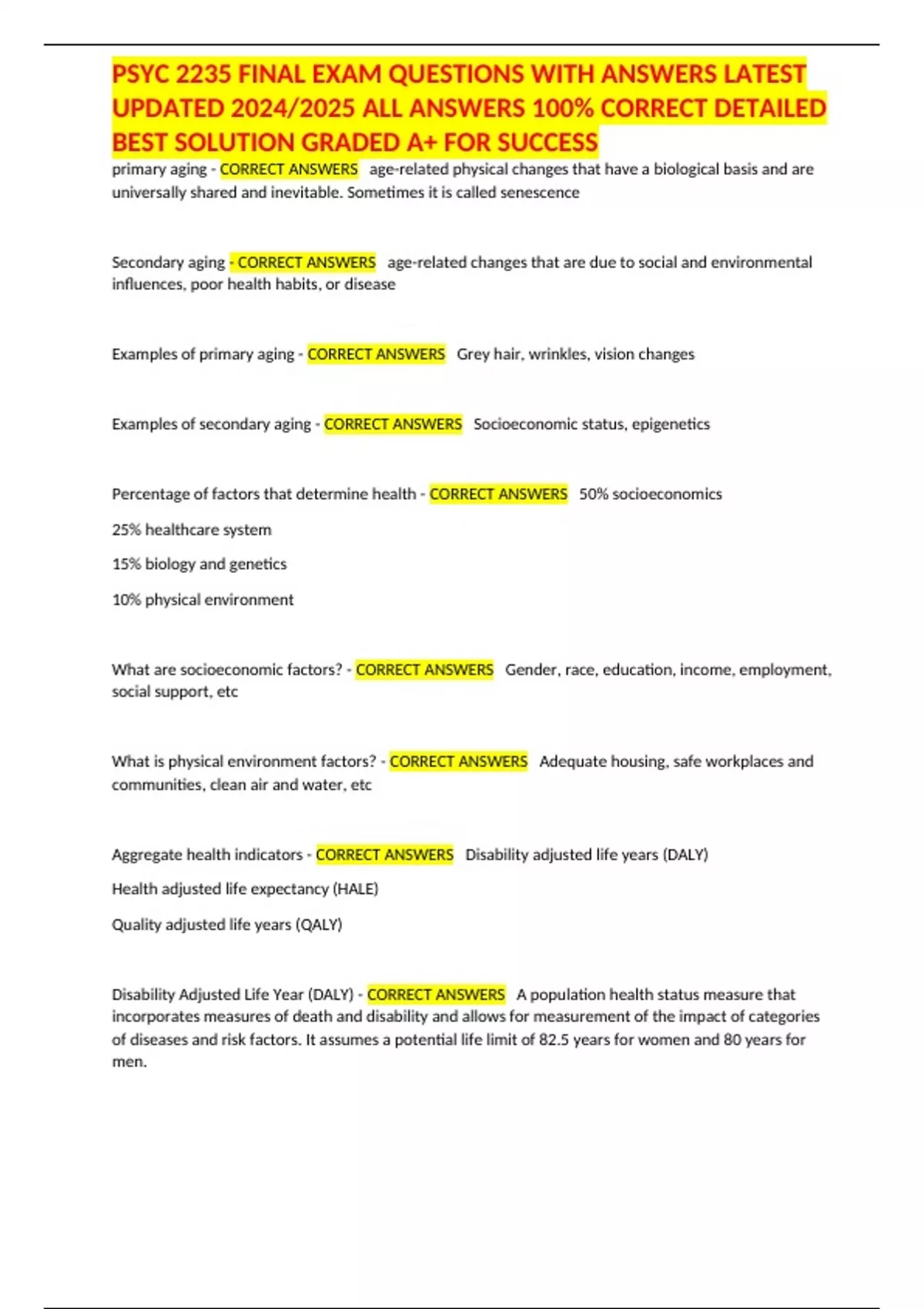 Aggregate health indicators - CORRECT ANSWERS Disability adjusted life years (DALY)
