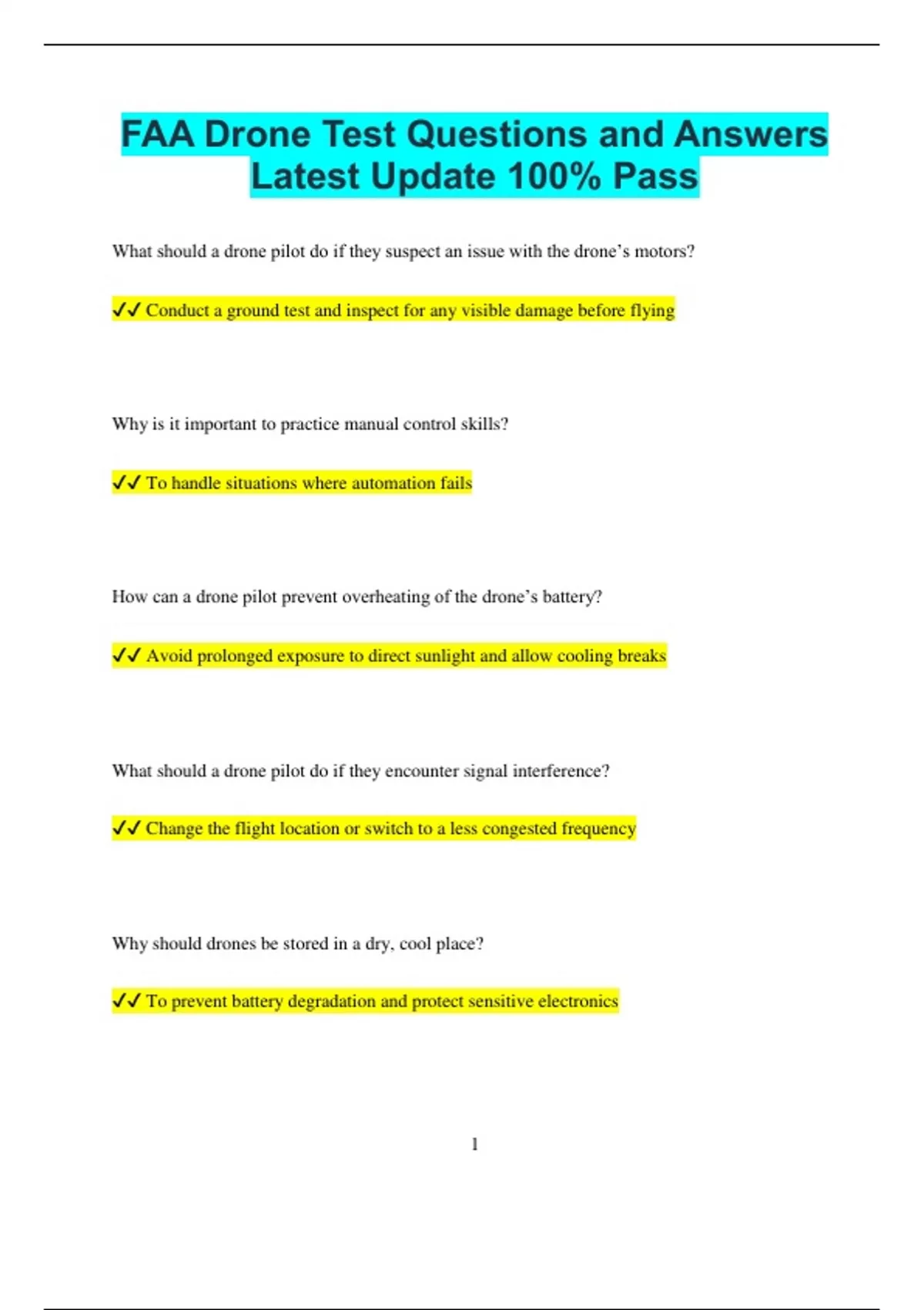 FAA Drone Test Questions and Answers Latest Update 100% Pass What should a drone pilot do if they suspect an issue with the drone’s motors? Conduct a ground test and inspect for any visible damage before flying Why is it important to practice manual control skills? To handle situations where automation fails How can a drone pilot prevent overheating of the drone’s battery? Avoid prolonged exposure to direct sunlight and allow cooling breaks What should a drone pilot do if they encounter signal interference? Change the flight location or switch to a less congested frequency Why should drones be stored in a dry, cool place? To prevent battery degradation and protect sensitive electronics 2 How can a drone pilot ensure a stable flight in windy conditions? Use GPS mode and maintain a lower altitude for better control What is the purpose of a drone’s return-to-home function? To automatically bring the drone back to a safe location if the signal is lost Why should drone pilots use propeller guards in certain environments? To reduce the risk of damage from obstacles or accidental contact What should a drone pilot do if they need to land in a confined space? Control descent carefully and use precision landing features if available Why is it important to verify the accuracy of the drone’s home point? To ensure a safe return location in case of emergency How can drone pilots avoid disturbing wildlife during a flight? Maintain a safe distance and avoid flying over nesting areas 3 What is the best way to handle a drone emergency landing over water? Try to reach the nearest land or activate emergency floatation if available What is the primary responsibility of a drone pilot before takeoff? To check weather conditions, airspace restrictions, and drone functionality Why should a drone pilot perform a pre-flight inspection? To ensure the drone is safe and ready for flight What is the purpose of registering a drone with the FAA? To comply with regulations and identify the owner if needed Why must a remote pilot always maintain visual line of sight with the drone? To avoid obstacles and other aircraft
