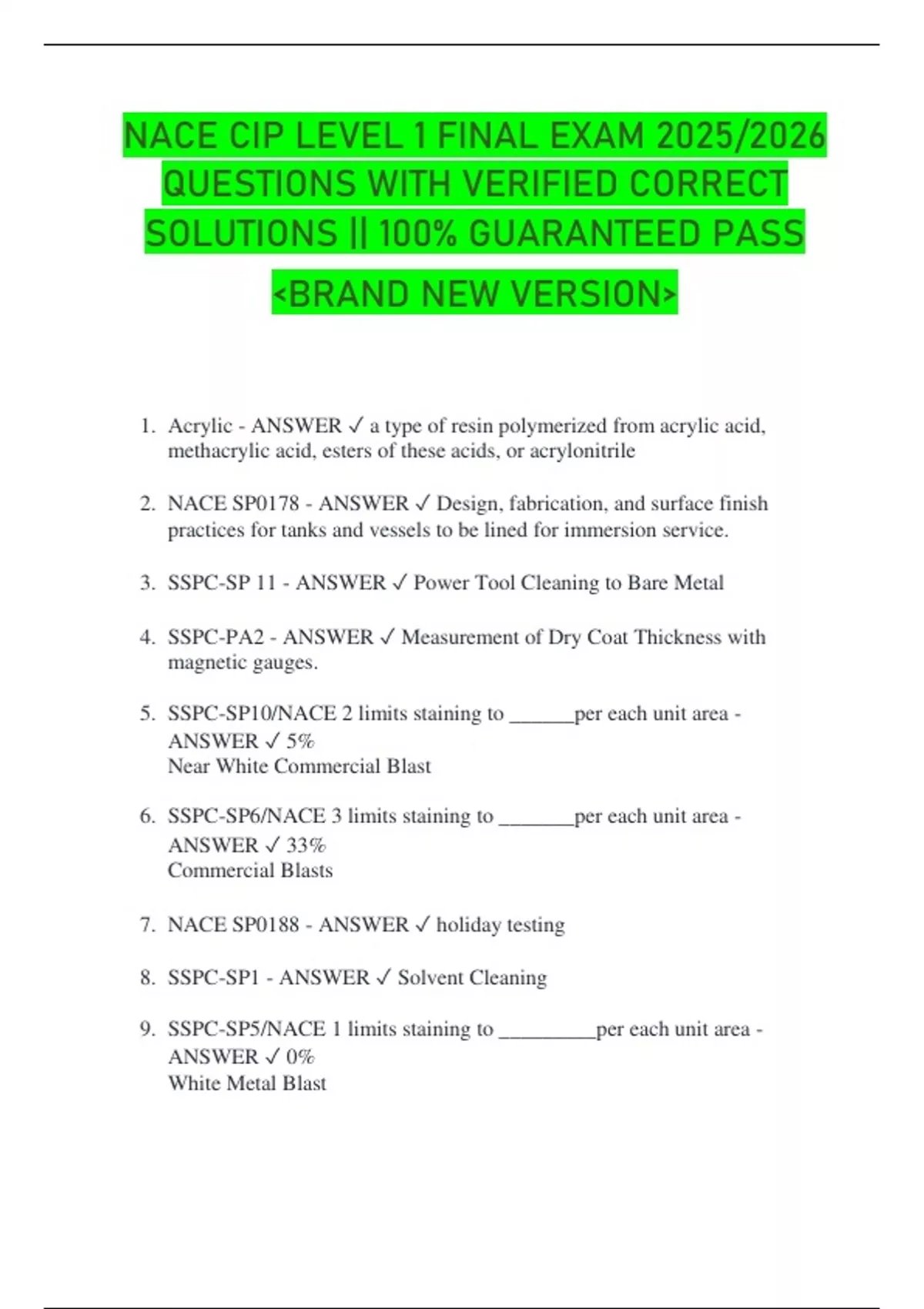 NACE CIP LEVEL 1 FINAL EXAM 2025/2026 QUESTIONS WITH VERIFIED CORRECT SOLUTIONS || 100% GUARANTEED PASS BRAND NEW VERSION 1. Acrylic - ANSWER a type of resin polymerized from acrylic acid, methacrylic acid, esters of these acids, or acrylonitrile 2. NACE SP0178 - ANSWER Design, fabrication, and surface finish practices for tanks and vessels to be lined for immersion service. 3. SSPC-SP 11 - ANSWER Power Tool Cleaning to Bare Metal 4. SSPC-PA2 - ANSWER Measurement of Dry Coat Thickness with magnetic gauges. 5. SSPC-SP10/NACE 2 limits staining to ______per each unit area - ANSWER 5% Near White Commercial Blast 6. SSPC-SP6/NACE 3 limits staining to _______per each unit area - ANSWER 33% Commercial Blasts 7. NACE SP0188 - ANSWER holiday testing 8. SSPC-SP1 - ANSWER Solvent Cleaning 9. SSPC-SP5/NACE 1 limits staining to _________per each unit area - ANSWER 0% White Metal Blast 10. SSPC-SP3 - ANSWER Power Tool Cleaning 11. SSPC-SP2 - ANSWER Hand Tool Cleaning 12. ASTM D 4417 - ANSWER surface profile blast cleaned steel 13. SA-3 - ANSWER Blast Cleaning to Visually Clean Steel 14. SA 2 1/2 - ANSWER Very Thorough Blast Cleaning 15. Sa 2 - ANSWER Thorough Blast Cleaning 16. SA 1 - ANSWER Light Blast Cleaning 17. St 3 - ANSWER Very Thorough Hand and Power Tool Cleaning 18. St 2 - ANSWER Thorough Hand and Power Tool Cleaning 19. 2 Non-convertible coating types - ANSWER 1. Evaporation cure 2. Coalescence cure 20. SSPC-VIS1 Defines surface covered with and rust as what grade? - ANSWER Grade B 21. SSPC-SP2 ISO St 3 ISO St 2 All deal with hand tool Cleaning. True or false? - ANSWER True 22. Acrylic - ANSWER A plastic resin that, when mixed with water and pigment, forms an inorganic and quick-drying paint medium. -Excellent UV and weather resistance 23. Polyaspartic - ANSWER -Used to achieve low or near zero VOC systems -pot lives from 5 minutes to several hours -Film builds up to (15 mils) DFT in a single pass 24. Phenolic - ANSWER Typically used where low PH environments and Higher Temperature are factors 25. latex (Emulsions) - ANSWER -Resins normally thermoplastic resin types -Coalescence curing (Non-convertible) 26. Furans - ANSWER -Applied by Brick layers not coating applicators. -Not a common coating type 27. Epoxy - ANSWER -Two parts, resin and hardener must be mixed. -Can be solvent-based, water-based, or solvent-free 28. Alkyds - ANSWER -Oxidative curing -Reffered to as "Oil Based Paints" 29. Define Corrosion - ANSWER The deterioration of a substance, usually a metal from a reaction with its environment 30. What is Passivation? - ANSWER A layer of oxides formed on the surface of a metal that provides corrosion protection. 31. What is an example of passivation? - ANSWER Stainless Steel 32. What are the elements of a corrosion cell? - ANSWER Anode, Cathode, Metallic Pathway, Electrolyte 33. Describe what happens at the anode. - ANSWER The metal dissolves into the electrolyte 34. What is the function of the electrolyte? - ANSWER Allows the passage of ions to connect the corrosion cell 35. What is the function of the metallic pathway? - ANSWER Allows the flow of electrons to connect the corrosion cell