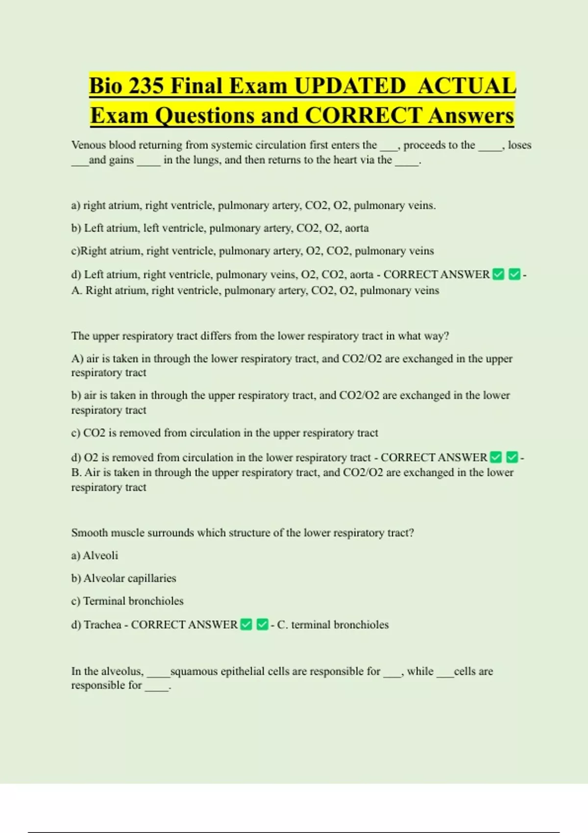Bio 235 Final Exam UPDATED ACTUAL Exam Questions and CORRECT Answers Venous blood returning from systemic circulation first enters the ___, proceeds to the ____, loses ___and gains ____ in the lungs, and then returns to the heart via the ____. a) right atrium, right ventricle, pulmonary artery, CO2, O2, pulmonary veins. b) Left atrium, left ventricle, pulmonary artery, CO2, O2, aorta c)Right atrium, right ventricle, pulmonary artery, O2, CO2, pulmonary veins d) Left atrium, right ventricle, pulmonary veins, O2, CO2, aorta - CORRECT ANSWER A. Right atrium, right ventricle, pulmonary artery, CO2, O2, pulmonary veins
