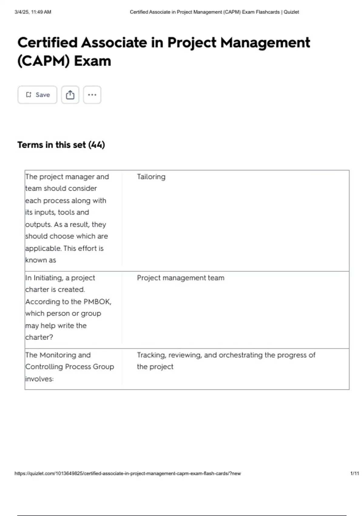, 3/4/25, 11:49 AM Certified Associate in Project Management (CAPM) Exam Flashcards | Quizlet