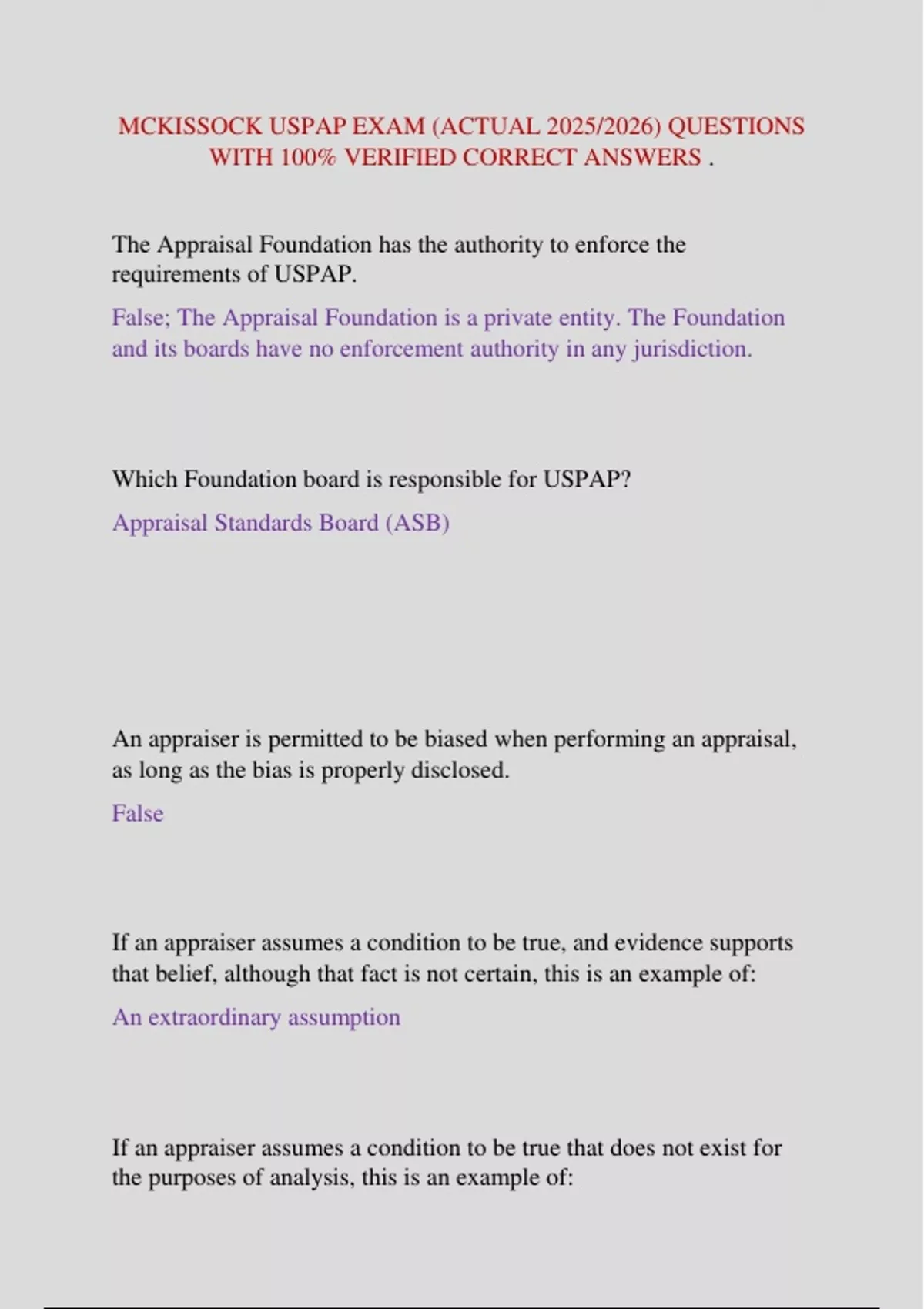 MCKISSOCK USPAP EXAM (ACTUAL 2025/2026) QUESTIONS WITH 100% VERIFIED CORRECT ANSWERS