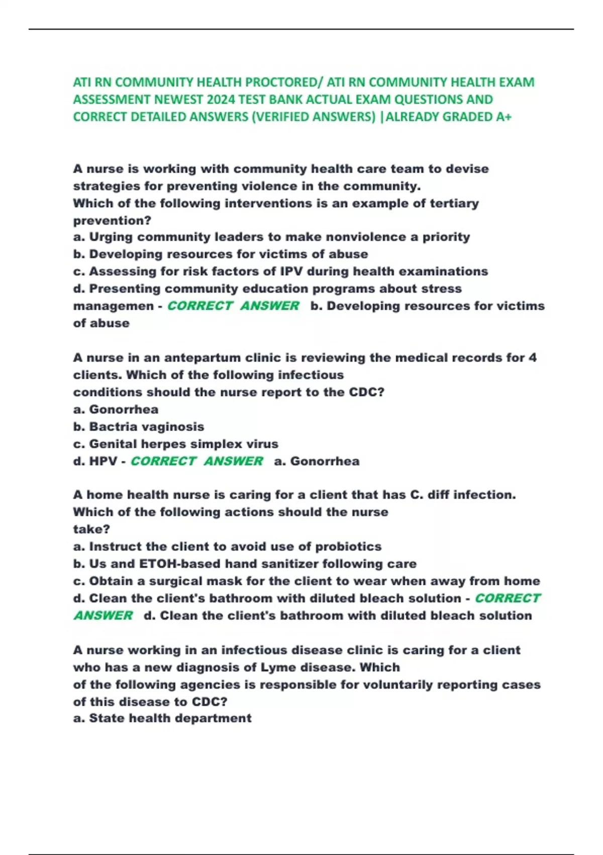 ATI RN COMMUNITY HEALTH PROCTORED/ ATI RN COMMUNITY HEALTH EXAM ASSESSMENT NEWEST 2024 TEST BANK ACTUAL EXAM QUESTIONS AND CORRECT DETAILED ANSWERS (VERIFIED ANSWERS) |ALREADY GRADED A+ A nurse is working with community health care team to devise strategies for preventing violence in the community. Which of the following interventions is an example of tertiary prevention? a. Urging community leaders to make nonviolence a priority b. Developing resources for victims of abuse c. Assessing for risk factors of IPV during health examinations d. Presenting community education programs about stress managemen - CORRECT ANSWER b. Developing resources for victims of abuse A nurse in an antepartum clinic is reviewing the medical records for 4 clients. Which of the following infectious conditions should the nurse report to the CDC? a. Gonorrhea b. Bactria vaginosis c. Genital herpes simplex virus d. HPV - CORRECT ANSWER a. Gonorrhea A home health nurse is caring for a client that has C. diff infection. Which of the following actions should the nurse take? a. Instruct the client to avoid use of probiotics b. Us and ETOH-based hand sanitizer following care c. Obtain a surgical mask for the client to wear when away from home d. Clean the client's bathroom with diluted bleach solution - CORRECT ANSWER d. Clean the client's bathroom with diluted bleach solution A nurse working in an infectious disease clinic is caring for a client who has a new diagnosis of Lyme disease. Which of the following agencies is responsible for voluntarily reporting cases of this disease to CDC? a. State health department b. Local red cross chapter c. Hospital infection control department d. Office of the surgeon general - CORRECT ANSWER a. State health department A nurse is in a clinic is reviewing home safety precautions with a client who is to begin radioactive iodine therapy. Which of the following statements by the client indicates an understanding of the teaching? a. I will use a toilet that is not used by others in my family b. I will wait one week after treatment to use a laxative c. I will allow my granddaughter to visit for 4 hours daily d. I will use cloth handkerchiefs instead of tissues - CORRECT ANSWER a. I will use a toilet that is not used by others in my family A nurse is teaching a group of clients about ways to prevent skin cancer. Which of the following statements by the nurse demonstrates a primary prevention strategy? a. Avoid direct sunlight b/t 10am-4pm b. Apply cool tap water soaks for 20 mins to relieve sunburn c. Use acetaminophen as needed for sunburn d. Ensure you have a yearly skin examination with your provider - CORRECT ANSWER a. Avoid direct sunlight b/t 10am-4pm A community nurse health nurse is working with a task force to decrease community violence. Which of the following planned interventions should the nurse identify as a primary prevention strategy? a. Providing parenting