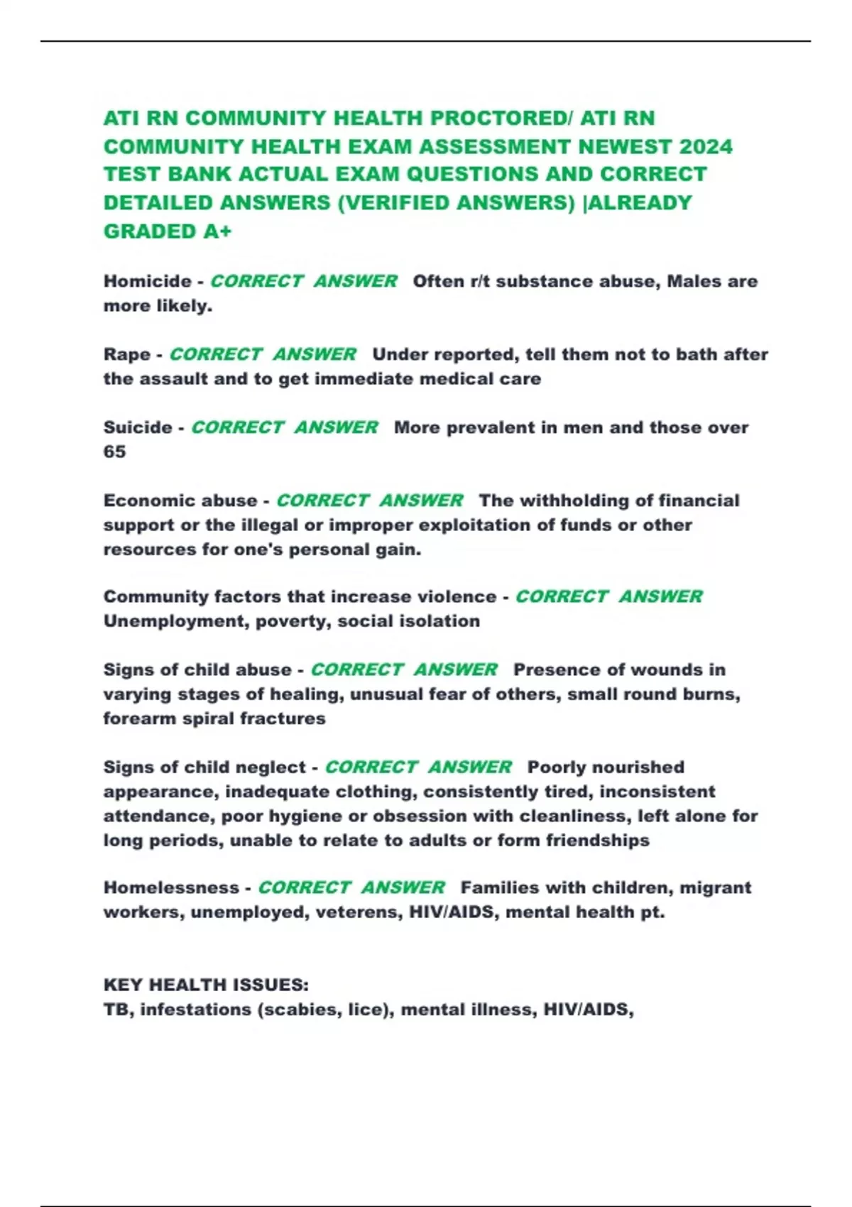ATI RN COMMUNITY HEALTH PROCTORED/ ATI RN COMMUNITY HEALTH EXAM ASSESSMENT NEWEST 2024 TEST BANK ACTUAL EXAM QUESTIONS AND CORRECT DETAILED ANSWERS (VERIFIED ANSWERS) |ALREADY GRADED A+ Homicide - CORRECT ANSWER Often r/t substance abuse, Males are more likely. Rape - CORRECT ANSWER Under reported, tell them not to bath after the assault and to get immediate medical care Suicide - CORRECT ANSWER More prevalent in men and those over 65 Economic abuse - CORRECT ANSWER The withholding of financial support or the illegal or improper exploitation of funds or other resources for one's personal gain. Community factors that increase violence - CORRECT ANSWER Unemployment, poverty, social isolation Signs of child abuse - CORRECT ANSWER Presence of wounds in varying stages of healing, unusual fear of others, small round burns, forearm spiral fractures Signs of child neglect - CORRECT ANSWER Poorly nourished appearance, inadequate clothing, consistently tired, inconsistent attendance, poor hygiene or obsession with cleanliness, left alone for long periods, unable to relate to adults or form friendships Homelessness - CORRECT ANSWER Families with children, migrant workers, unemployed, veterens, HIV/AIDS, mental health pt. KEY HEALTH ISSUES: TB, infestations (scabies, lice), mental illness, HIV/AIDS, Veterans - CORRECT ANSWER KEY HEALTH ISSUES: substance abuse, suicide, spinal cord injuries, amputations, PTSD, depression. Migrant Workers - CORRECT ANSWER KEY HEALTH ISSUES: TB, dental dz, skin cancer, DM, obesity, suicide, work related injuries mode of transmission - CORRECT ANSWER Airborne Foodborne Waterborne Vectorborne STIs Direct contact Airborne - CORRECT ANSWER Chicken pox, TB, pertussis, influenza Foodborne - CORRECT ANSWER Salmonella, Hep. A, E. coli, botulism Waterborne - CORRECT ANSWER Cholera, Shigellosis, typhoid fever Vectorborne - CORRECT ANSWER Lime dz, maleria, rocky mountain spotted fever