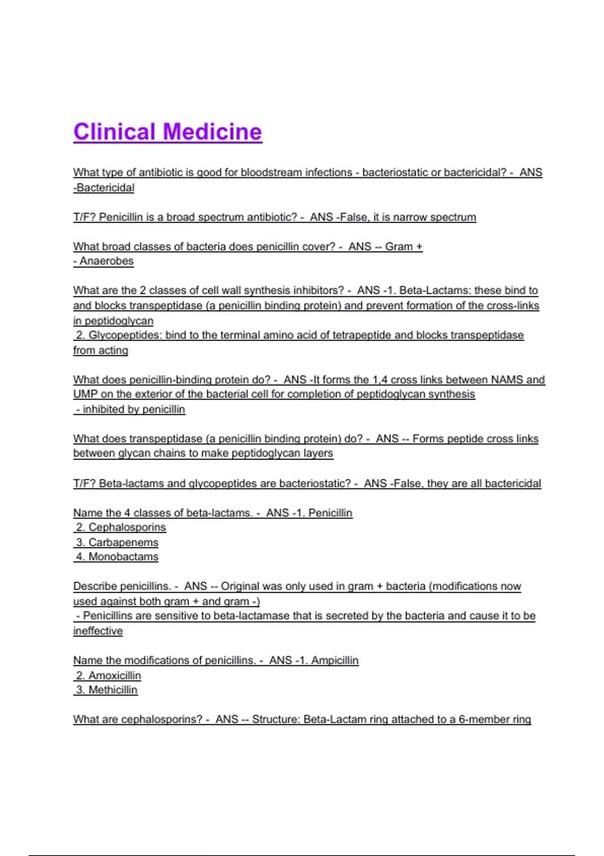 T/F? Penicillin inhibits cell wall synthesis? - ANS -True