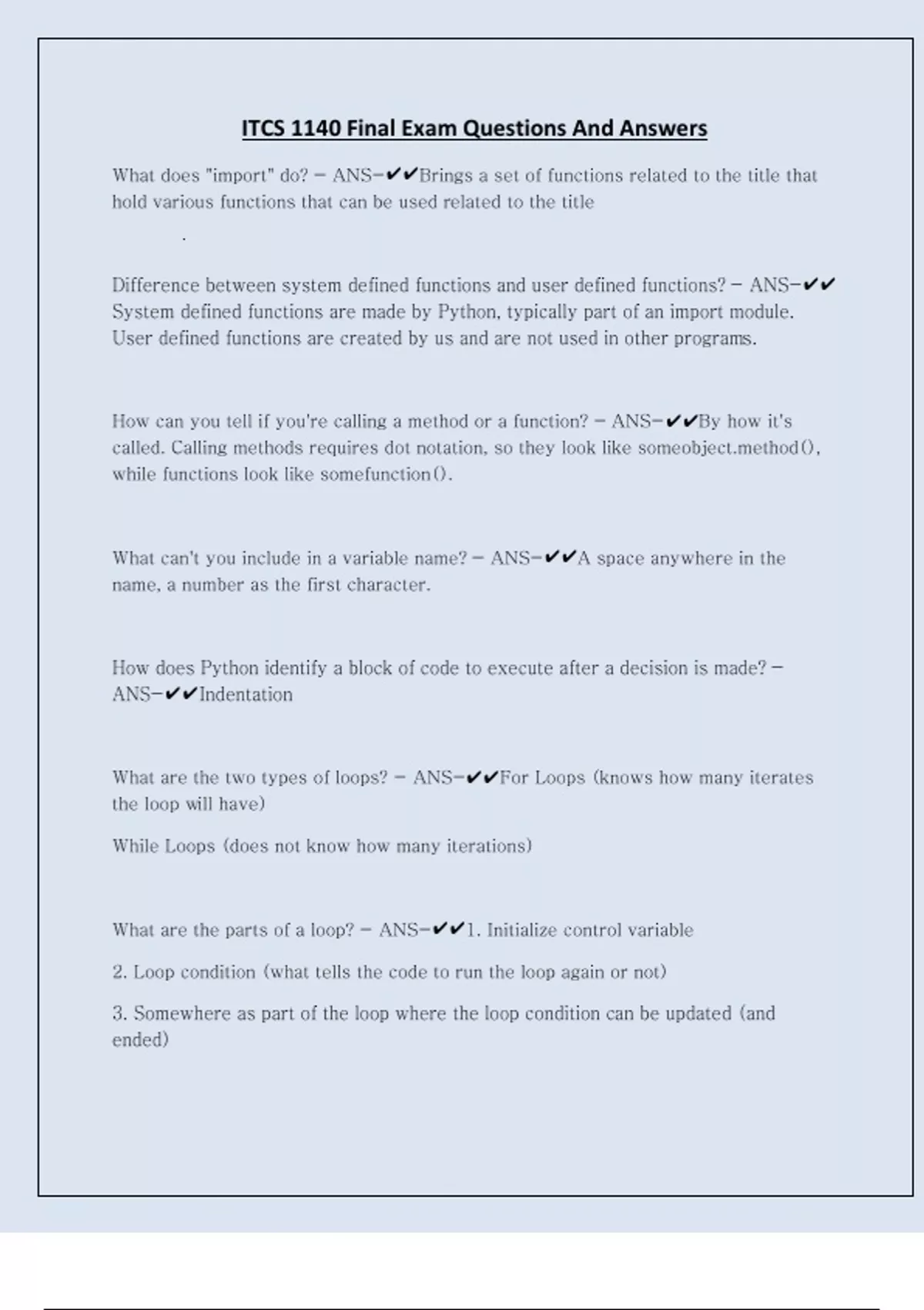 ITCS 1140 Final Exam Questions And Answers What does "import" do? - ANS-Brings a set of functions related to the title that hold various functions that can be used related to the title Difference between system defined functions and user defined functions? - ANS-System defined functions are made by Python, typically part of an import module. User defined functions are created by us and are not used in other programs. How can you tell if you're calling a method or a function? - ANS-By how it's called. Calling methods requires dot notation, so they look like d(), while functions look like somefunction(). What can't you include in a variable name? - ANS-A space anywhere in the name, a number as the first character. How does Python identify a block of code to execute after a decision is made? - ANS-Indentation What are the two types of loops? - ANS-