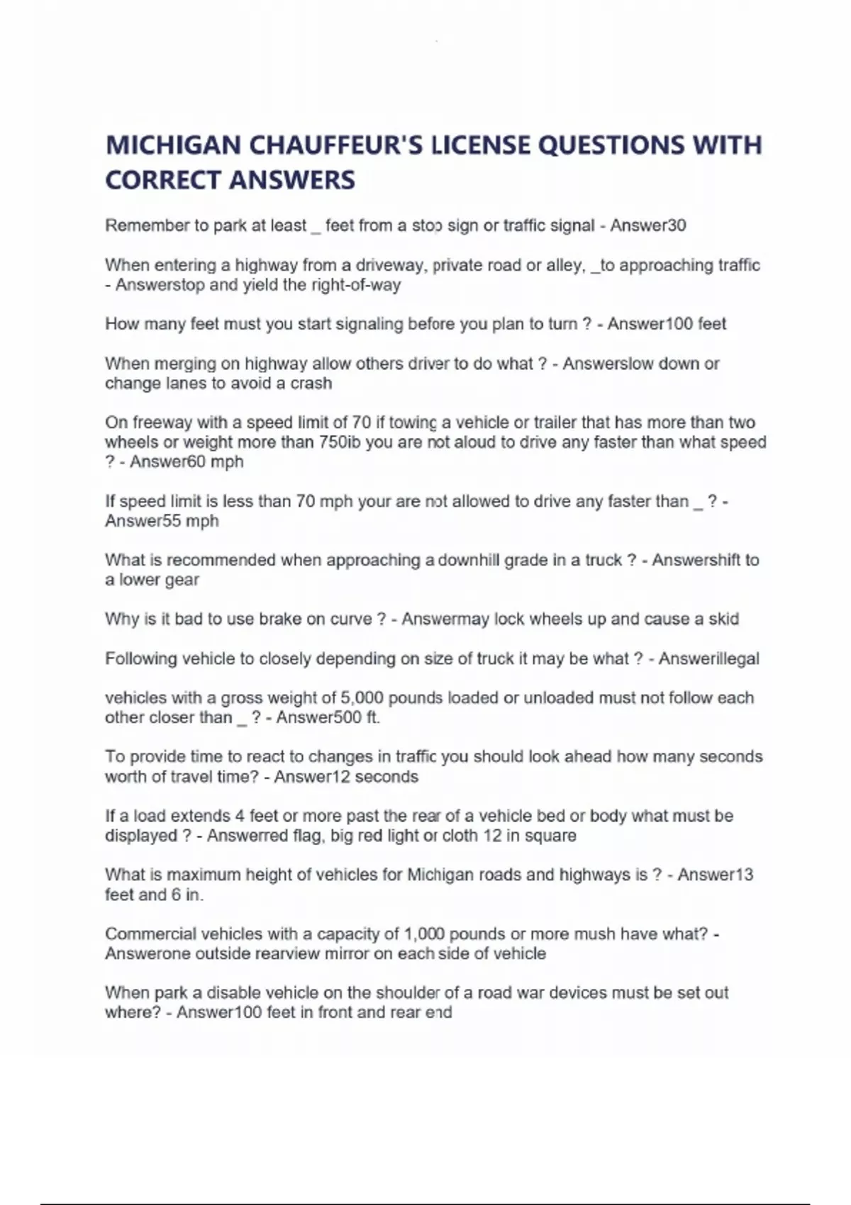 MICHIGAN CHAUFFEUR'S LICENSE QUESTIONS WITH CORRECT ANSWERS Remember to park at least _ feet from a stop sign or traffic signal - Answer30 When entering a highway from a driveway, private road or alley, _to approaching traffic - Answerstop and yield the right-of-way How many feet must you start signaling before you plan to turn ? - Answer100 feet When merging on highway allow others driver to do what ? - Answerslow down or change lanes to avoid a crash On freeway with a speed limit of 70 if towing a vehicle or trailer that has more than two wheels or weight more than 750ib you are not aloud to drive any faster than what speed ? - Answer60 mph If speed limit is less than 70 mph your are not allowed to drive any faster than _ ? - Answer55 mph What is recommended when approaching a downhill grade in a truck ? - Answershift to a lower gear Why is it bad to use brake on curve ? - Answermay lock wheels up and cause a skid Following vehicle to closely depending on size of truck it may be what ? - Answerillegal vehicles with a gross weight of 5,000 pounds loaded or unloaded must not follow each other closer than _ ? - Answer500 ft. To provide time to react to changes in traffic you should look ahead how many seconds worth of travel time? - Answer12 seconds If a load extends 4 feet or more past the rear of a vehicle bed or body what must be displayed ? - Answerred flag, big red light or cloth 12 in square What is maximum height of vehicles for Michigan roads and highways is ? - Answer13 feet and 6 in. Commercial vehicles with a capacity of 1,000 pounds or more mush have what? - Answerone outside rearview mirror on each side of vehicle When park a disable vehicle on the shoulder of a road war devices must be set out where? - Answer100 feet in front and rear end When brakes are wet from heavy water do what? - Answergently apply brakes until they work properly again - Answer