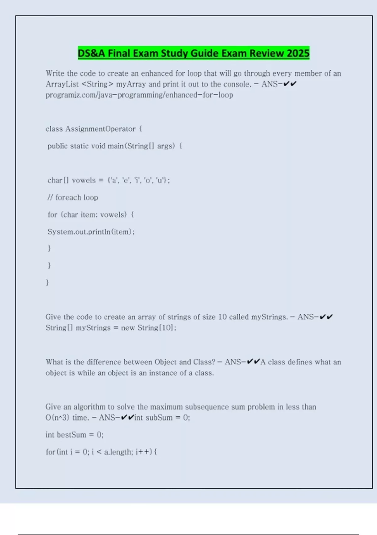 DS&A Final Exam Study Guide Exam Review 2025 Write the code to create an enhanced for loop that will go through every member of an ArrayList <String> myArray and print it out to the console. - ANS- class AssignmentOperator { public static void main(String[] args) { char[] vowels = {'a', 'e', 'i', 'o', 'u'}; // foreach loop for (char item: vowels) { Sln(item); } } } Give the code to create an array of strings of size 10 called myStrings. - ANS-String[] myStrings = new String[10]; What is the difference between Object and Class? - ANS-A class defines what an object is while an object is an instance of a class. Give an algorithm to solve the maximum subsequence sum problem in less than O(n^3) time. - ANS-int subSum = 0; int bestSum = 0; for(int i = 0; i < h; i++){