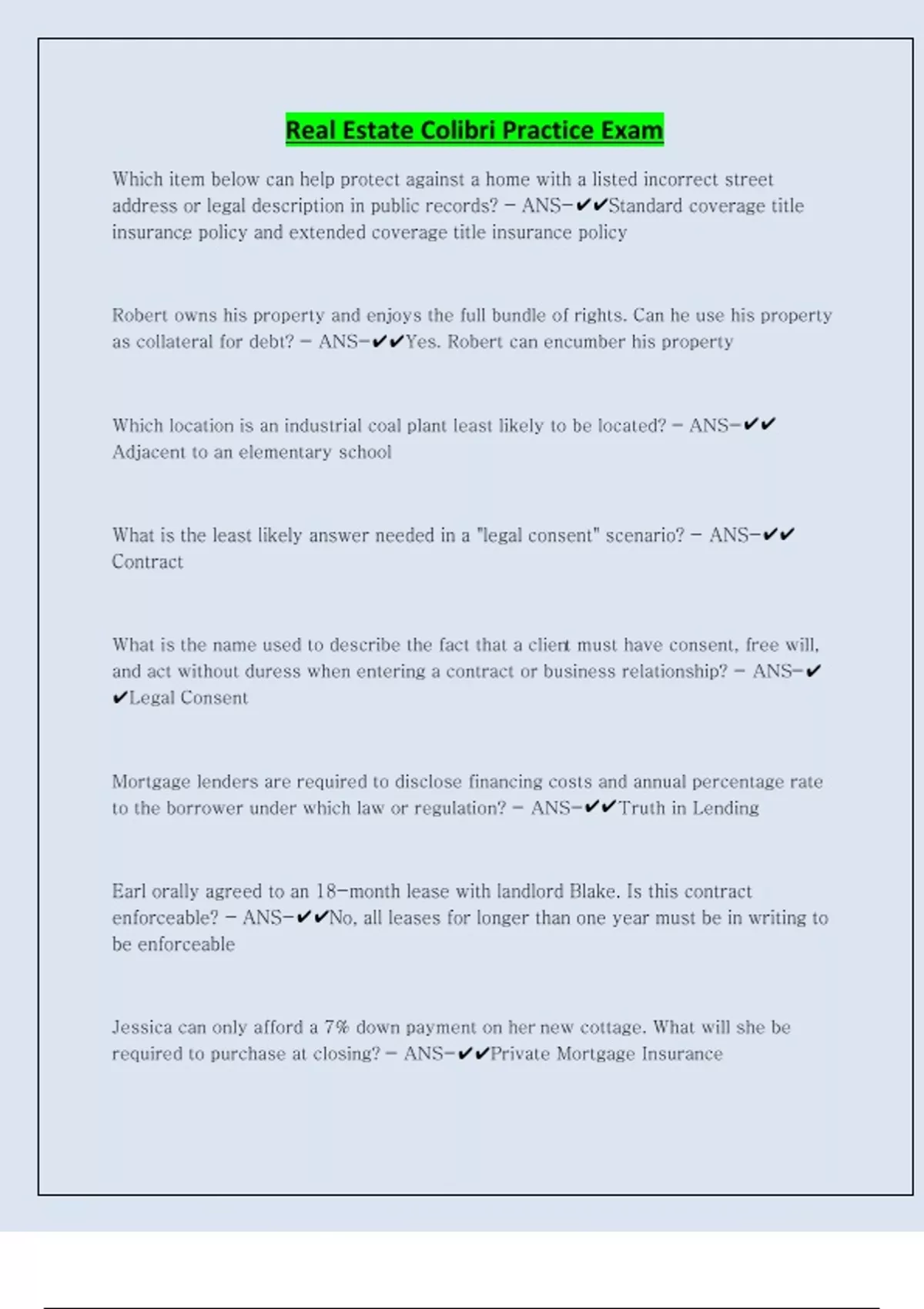 Real Estate Colibri Practice Exam Which item below can help protect against a home with a listed incorrect street address or legal description in public records? - ANS-Standard coverage title insurance policy and extended coverage title insurance policy Robert owns his property and enjoys the full bundle of rights. Can he use his property as collateral for debt? - ANS-Yes. Robert can encumber his property Which location is an industrial coal plant least likely to be located? - ANS-Adjacent to an elementary school What is the least likely answer needed in a "legal consent" scenario? - ANS-Contract What is the name used to describe the fact that a client must have consent, free will, and act without duress when entering a contract or business relationship? - ANS-Legal Consent Mortgage lenders are required to disclose financing costs and annual percentage rate to the borrower under which law or regulation? - ANS-Truth in Lending Earl orally agreed to an 18-month lease with landlord Blake. Is this contract enforceable? - ANS-