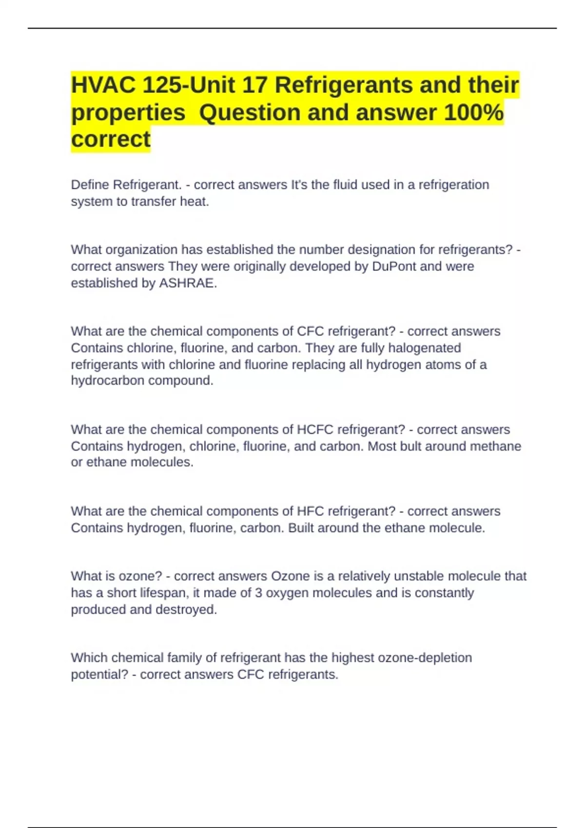 HVAC 125-Unit 17 Refrigerants and their properties Question and answer 100% correct Define Refrigerant. - correct answers It's the fluid used in a refrigeration system to transfer heat. What organization has established the number designation for refrigerants? - correct answers They were originally developed by DuPont and were established by ASHRAE. What are the chemical components of CFC refrigerant? - correct answers Contains chlorine, fluorine, and carbon. They are fully halogenated refrigerants with chlorine and fluorine replacing all hydrogen atoms of a hydrocarbon compound. What are the chemical components of HCFC refrigerant? - correct answers Contains hydrogen, chlorine, fluorine, and carbon. Most bult around methane or ethane molecules.