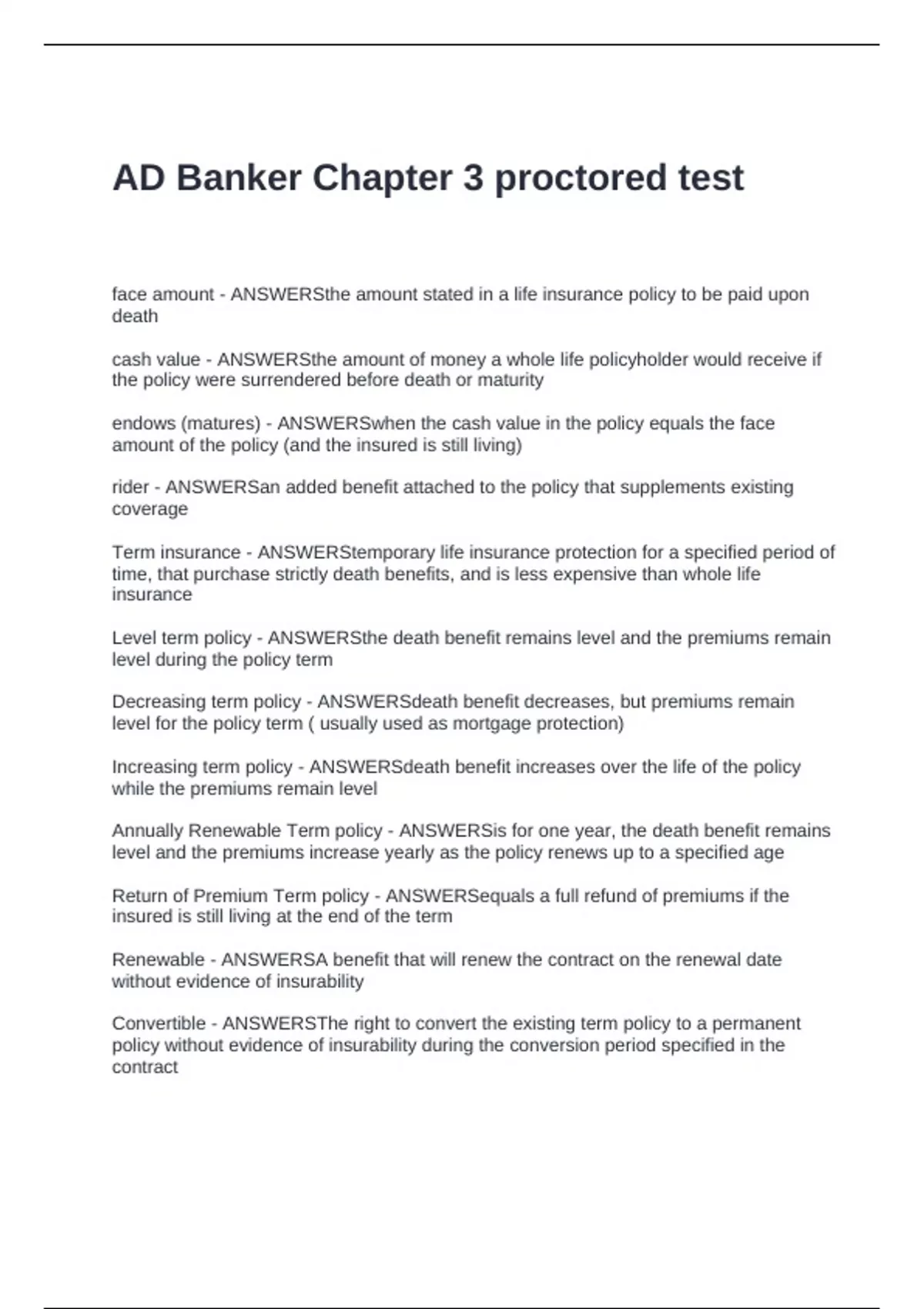 Annually Renewable Term policy - ANSWERSis for one year, the death benefit remains