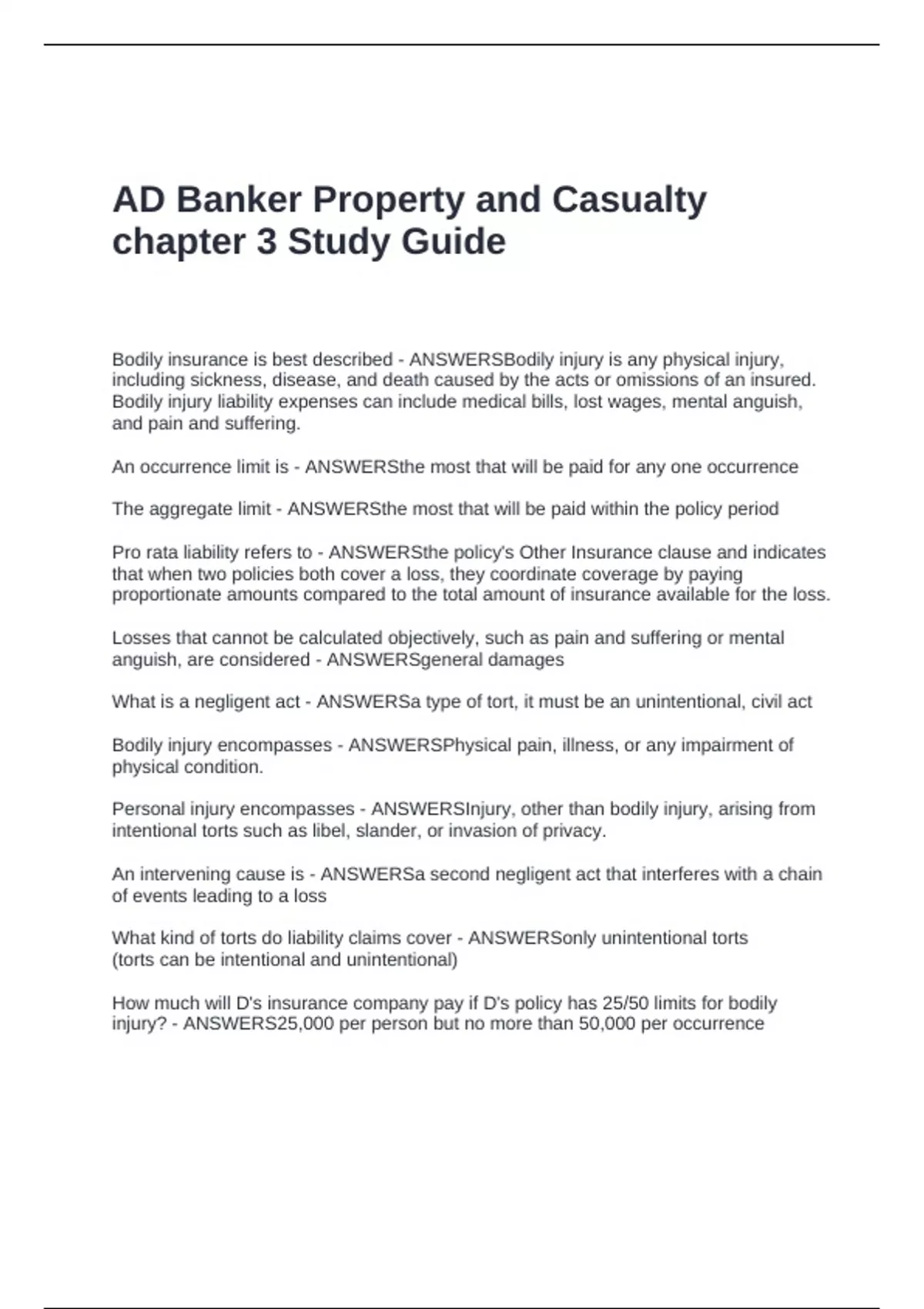 Bodily insurance is best described - ANSWERSBodily injury is any physical injury, including sickness, disease, and death caused by the acts or omissions of an insured. Bodily injury liability expenses can include medical bills, lost wages, mental anguish, and pain and suffering. An occurrence limit is - ANSWERSthe most that will be paid for any one occurrence The aggregate limit - ANSWERSthe most that will be paid within the policy period Pro rata liability refers to - ANSWERSthe policy's Other Insurance clause and indicates that when two policies both cover a loss, they coordinate coverage by paying proportionate amounts compared to the total amount of insurance available for the loss. Losses that cannot be calculated objectively, such as pain and suffering or mental anguish, are considered - ANSWERSgeneral damages What is a negligent act - ANSWERSa type of tort, it must be an unintentional, civil act Bodily injury encompasses - ANSWERSPhysical pain, illness, or any impairment of physical condition. Personal injury encompasses - ANSWERSInjury, other than bodily injury, arising from intentional torts such as libel, slander, or invasion of privacy. An intervening cause is - ANSWERSa second negligent act that interferes with a chain of events leading to a loss What kind of torts do liability claims cover - ANSWERSonly unintentional torts (torts can be intentional and unintentional) How much will D's insurance company pay if D's policy has 25/50 limits for bodily injury? - ANSWERS25,000 per person but no more than 50,000 per occurrence Liability insurance is a two-party contract with payments made to which of the following? - ANSWERSUnder the terms of the policy, the insurer will pay those sums owed by the insured to a third party, whom the insured may have negligently damaged by a tort What are punitive damages - ANSWERSPunitive damages are awarded to punish a negligent party for extremely objectionable conduct What does no-fault policies do - ANSWERSunder no-fault insurance, the injured party collects insurance benefits from his/her own insurance as if it were first-party coverage, eliminating the need to determine negligence or legal liability Describe assumption of risk - ANSWERSwhen a person participates in an activity where a certain type of injury is known to be probable, that person's rights of recovery are barred or diminished under the doctrine of assumption of risk Which policy liability limits that may be applied to either bodily injury or property damage, in any combination - ANSWERScombined single limits Comparative negligence - ANSWERSprovides that the damages recoverable by each party to the suit be reduced in proportion to that party's degree of negligence. a proof loss provided by the insured is - ANSWERSa formal statement provided to the insurer that provides necessary details for the insurer to determine its liability under a policy. list three instances that a liability policy will cover - ANSWERSthey are designed to cover third party injuries or damages they do not cover medical expenses incurred by the insured they will pay sums that the insured becomes legally liable to pay (they will not cover the insured's own property) describe limit of liability - ANSWERSthe limits of liability, or limits of insurance, are shown on the policy's Declarations page and are the most paid by the policy regardless of the number of insureds, claims made, lawsuits filed, or parties making claims or filing lawsuits what is the best explanation of liability insurance? - ANSWERSIt provides protection in the event the insured's negligence causes bodily injury or property damage to others and the insured becomes legally obligated to pay damages Which of the following prevents recovery for injuries caused by a negligent party if the claimant was also negligent? - ANSWERSThe contributory negligence defense denies payment to an injured party if they were partly at fault. A certificate of insurance includes which of the following pieces of information? - ANSWERSThe effective date, names of the insurer and named insured, and the limits of liability Which of the following statements best describes the Other Insurance condition on a standard property insurance policy, when two separate property policies provide coverage for the same loss? - ANSWERSEach policy pays its pro rata share of the loss what is limited under DP-3 - ANSWERSnamed exclusions Under Dwelling policies, household and personal property, including property in transit between the insured's old and new residences, are covered under: - ANSWERScoverage C what form is coverage E additional living expenses not available to - ANSWERSDP-1 basic dwelling form what kind of peril basis does the DP-3 special form cover - ANSWERSan open perils basis what does the VMM endorsement provide - ANSWERSIf the insured desires vandalism coverage an endorsement and additional premium is required. Vandalism of vacant buildings is excluded even under the endorsement. A dwelling under construction is protected by a Broad Form Dwelling policy with the Dwelling Under Construction Endorsement. While under construction, the applicable Coverage A limit is: - ANSWERSUnder the Dwelling Under Construction Endorsement, the Coverage A limit of insurance is provisional. At any given time prior to completion, the limit that actually applies is a percentage of the stated Coverage A limit, equal to the proportion the actual value bears to the value on the date of completion. The insurer must be notified of completion so coverage may be adjusted. Which Dwelling form does not cover losses resulting from frozen plumbing? - ANSWERSDP-1 Under a Dwelling Policy, an insured tenant may use up to what percentage of the Coverage C limit of insurance for a covered loss to improvements, alterations, and additions made at the insured's expense to that part of the described location occupied by the named insured? - ANSWERS10%