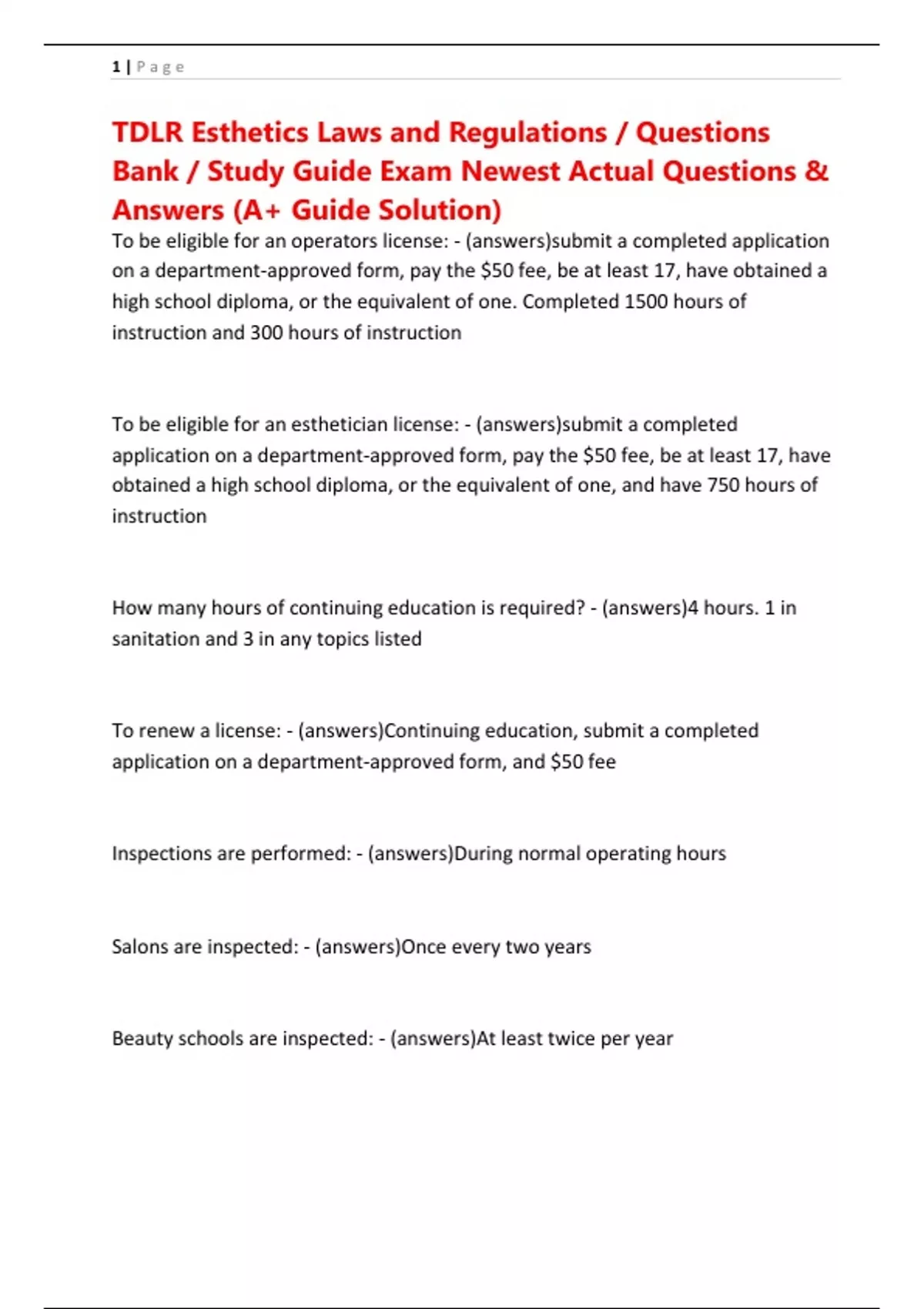 TDLR Esthetics Laws and Regulations / Questions Bank / Study Guide Exam Newest Actual Questions & Answers (A+ Guide Solution)