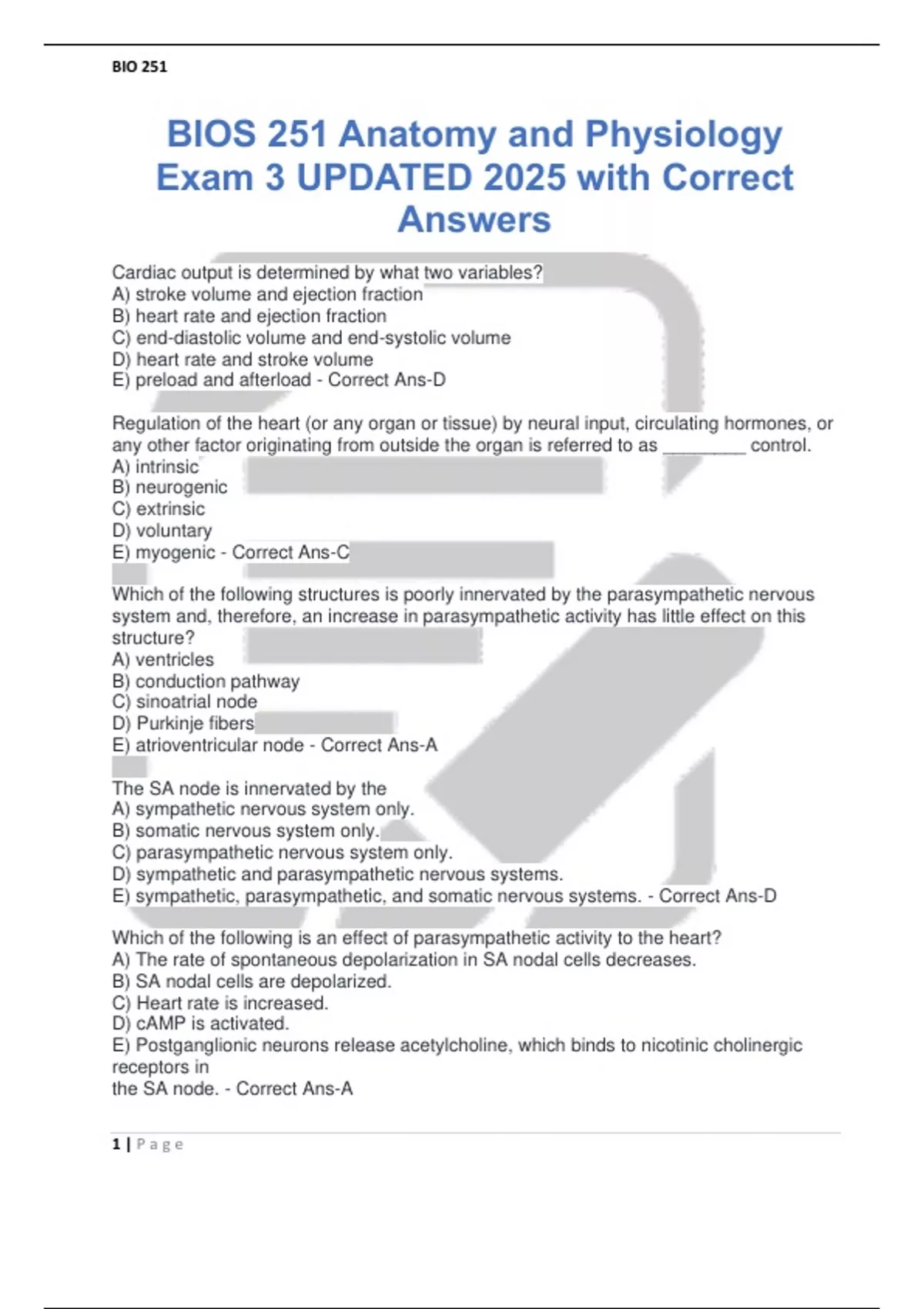 Cardiac output is determined by what two variables? A) stroke volume and ejection fraction B) heart rate and ejection fraction C) end-diastolic volume and end-systolic volume D) heart rate and stroke volume E) preload and afterload - Correct Ans-D Regulation of the heart (or any organ or tissue) by neural input, circulating hormones, or any other factor originating from outside the organ is referred to as ________ control. A) intrinsic B) neurogenic C) extrinsic D) voluntary E) myogenic - Correct Ans-C Which of the following structures is poorly innervated by the parasympathetic nervous system and, therefore, an increase in parasympathetic activity has little effect on this structure? A) ventricles B) conduction pathway C) sinoatrial node D) Purkinje fibers E) atrioventricular node - Correct Ans-A The SA node is innervated by the A) sympathetic nervous system only. B) somatic nervous system only. C) parasympathetic nervous system only. D) sympathetic and parasympathetic nervous systems. E) sympathetic, parasympathetic, and somatic nervous systems. - Correct Ans-D Which of the following is an effect of parasympathetic activity to the heart? A) The rate of spontaneous depolarization in SA nodal cells decreases. B) SA nodal cells are depolarized. C) Heart rate is increased. D) cAMP is activated. E) Postganglionic neurons release acetylcholine, which binds to nicotinic cholinergic receptors in the SA node. - Correct Ans-A Which of the following is a FALSE statement about sympathetic activity to the SA node? A) Norepinephrine binds to beta1 adrenergic receptors. B) Potassium channel closing is enhanced. C) cAMP levels in the pacemaker cells increases. D) Funny channel opening is enhanced. E) The rate of spontaneous depolarization is increased. - Correct Ans-B Under resting conditions, heart rate is primarily under the control of what control system? A) the parasympathetic nervous system B) the somatic nervous system C) the sympathetic nervous system D) intrinsic mechanisms E) epinephrine - Correct Ans-A An increase in heart rate can be mediated through which of the following? A) a decrease in parasympathetic nervous activity only B) a decrease in sympathetic activity only C) an increase in sympathetic activity only D) an increase in parasympathetic activity and a decrease in sympathetic activity E) a decrease in parasympathetic activity and an increase in sympathetic activity - Correct Ans-E Which of the following would NOT result from an increase in ventricular contractility? A) increased ejection fraction B) increased stroke volume C) decreased end-diastolic volume D) decreased end-systolic volume E) increased proportion of end-diastolic volume that is ejected - Correct Ans-C Which of the following best describes the effect of sympathetic activity on ventricular contractile cells? A) The rates of contraction and relaxation both decrease, whereas the force of contraction increases. B) The rates of contraction and relaxation both increase, whereas the force of contraction decreases. C) The rate of contraction and the force of contraction both increase, whereas the rate of relaxation decreases. D) The rates of contraction and relaxation and the force of contraction all increase. E) The force of contraction increases, whereas the rates of contraction and relaxation are not affected. - Correct Ans-D