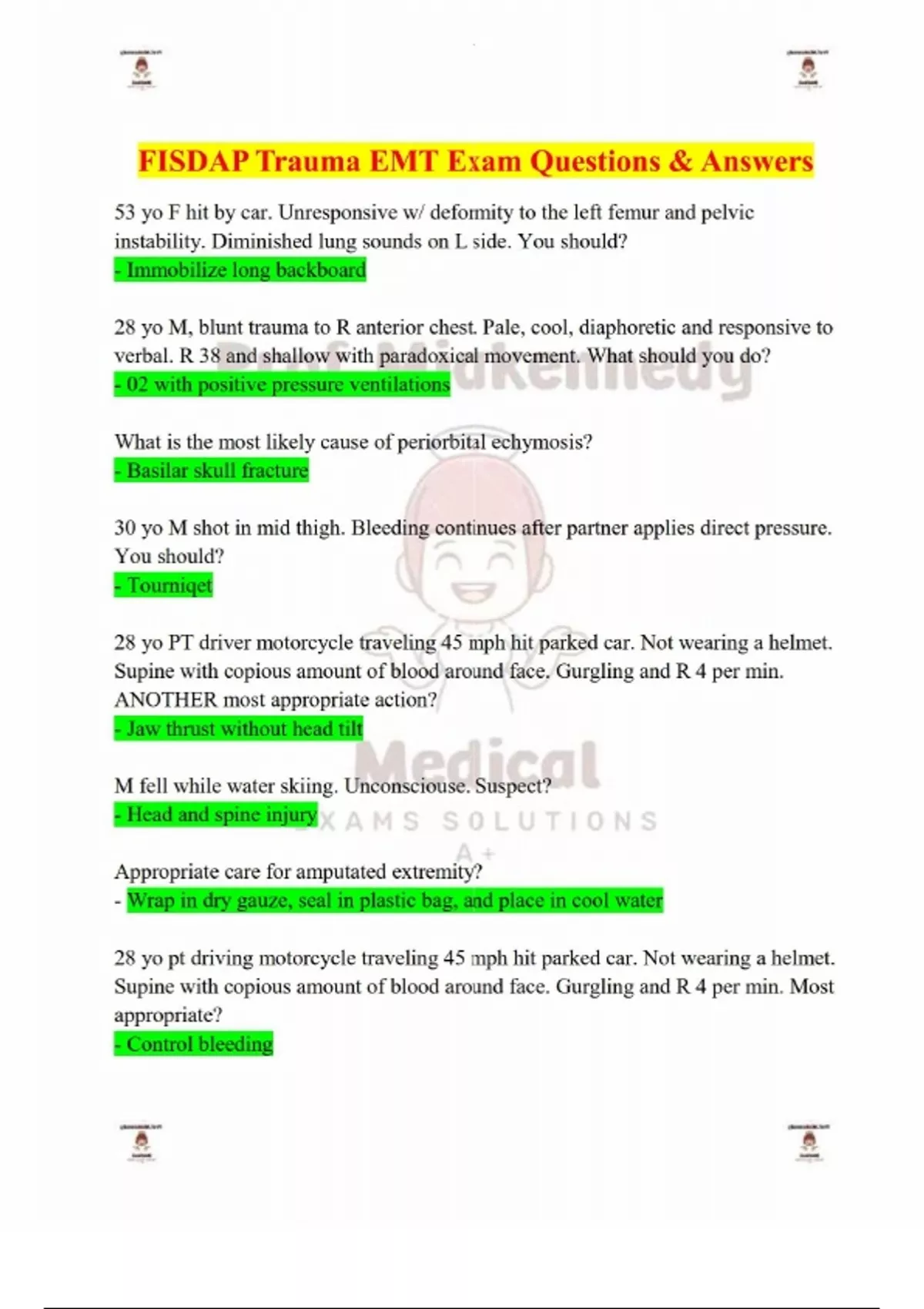 FISDAP Trauma EMT Exam Questions & Answers-53 yo F hit by car. Unresponsive w/ deformity to the left femur and pelvic instability. Diminished lung sounds on L side. You should? - Immobilize long backboard 28 yo M, blunt trauma to R anterior chest. Pale, cool, diaphoretic and responsive to verbal. R 38 and shallow with paradoxical movement. What should you do? - 02 with positive pressure ventilations What is the most likely cause of periorbital echymosis? - Basilar skull fracture 30 yo M shot in mid thigh. Bleeding continues after partner applies direct pressure. You should? - Tourniqet 28 yo PT driver motorcycle traveling 45 mph hit parked car. Not wearing a helmet. Supine with copious amount of blood around face. Gurgling and R 4 per min. ANOTHER most appropriate action? - Jaw thrust without head tilt M fell while water skiing. Unconsciouse. Suspect? - Head and spine injury Appropriate care for amputated extremity? - Wrap in dry gauze, seal in plastic bag, and place in cool water 28 yo pt driving motorcycle traveling 45 mph hit parked car. Not wearing a helmet. Supine with copious amount of blood around face. Gurgling and R 4 per min. Most appropriate? - Control bleeding