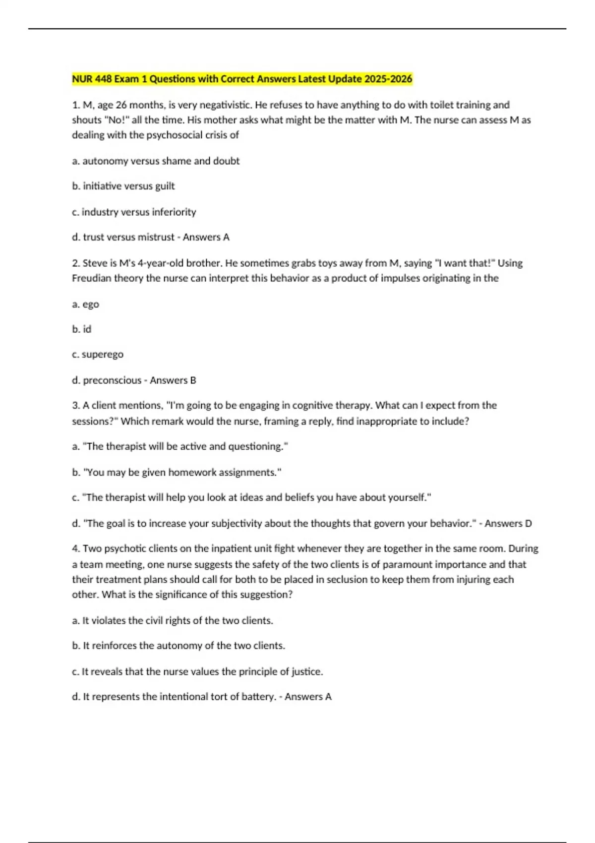 NUR 448 Exam 1 Questions with Correct Answers Latest Update 1. M, age 26 months, is very negativistic. He refuses to have anything to do with toilet training and shouts "No!" all the time. His mother asks what might be the matter with M. The nurse can assess M as dealing with the psychosocial crisis of a. autonomy versus shame and doubt b. initiative versus guilt c. industry versus inferiority d. trust versus mistrust - Answers A 2. Steve is M's 4-year-old brother. He sometimes grabs toys away from M, saying "I want that!" Using Freudian theory the nurse can interpret this behavior as a product of impulses originating in the a. ego b. id c. superego d. preconscious - Answers B 3. A client mentions, "I'm going to be engaging in cognitive therapy. What can I expect from the sessions?" Which remark would the nurse, framing a reply, find inappropriate to include? a. "The therapist will be active and questioning." b. "You may be given homework assignments." c. "The therapist will help you look at ideas and beliefs you have about yourself." d. "The goal is to increase your subjectivity about the thoughts that govern your behavior." - Answers D 4. Two psychotic clients on the inpatient unit fight whenever they are together in the same room. During a team meeting, one nurse suggests the safety of the two clients is of paramount importance and that their treatment plans should call for both to be placed in seclusion to keep them from injuring each other. What is the significance of this suggestion? a. It violates the civil rights of the two clients. b. It reinforces the autonomy of the two clients. c. It reveals that the nurse values the principle of justice. d. It represents the intentional tort of battery. - Answers A 5. In a treatment team planning meeting a nurse states her concern about whether the staff is behaving ethically in using restraint to prevent one client from engaging in self-mutilative behavior when the care plan for another self-mutilating client calls for one-on-one supervision. The ethical principle that should govern the situation is a. beneficence b. autonomy c. fidelity d. justice - Answers D 6. A client tells the nurse, "When I saw my therapist yesterday, he made sexual advances. He stroked my breast and suggested that he will give me a pass to leave the hospital if I will meet him at his apartment." What action should the nurse take? a. None. Psychiatric clients are not reliable. b. Report the client's statements to the unit nurse manager. c. Discuss the statements with the medical director. d. Call the state medical board. - Answers B 7. J became aggressive, struck another client, and required seclusion. Which of the following would be an appropriate way to document this event? a. "Client apparently doesn't like client X as evidenced by his striking client X when client attempted to leave day room to go to bathroom. Seclusion necessary at 2:15 pm. Plan: Maintain seclusion for 8 hours and keep this client and client X away from each other for 24 hours." b. "Seclusion ordered by Dr. at 2:15 pm when voices told the client to hit another client." c. "Client pacing, shouting at people not present in the environment. Chlorpromazine 50 mg p.o. at 1 pm with no effect by 2 pm. At 2:15 pm client shouted that he would punch the first person who got near him, then struck client X on the jaw with his fist as client X walked out of day room to go to bathroom. Client physically restrained by staff and placed in seclusion by order of Dr." d. "Seclusion begun at 2 - Answers C 8. Which nursing intervention could be considered to violate the rights of the psychiatric client? a. The nurse imposes suicide precautions before the client has been interviewed by the physician.