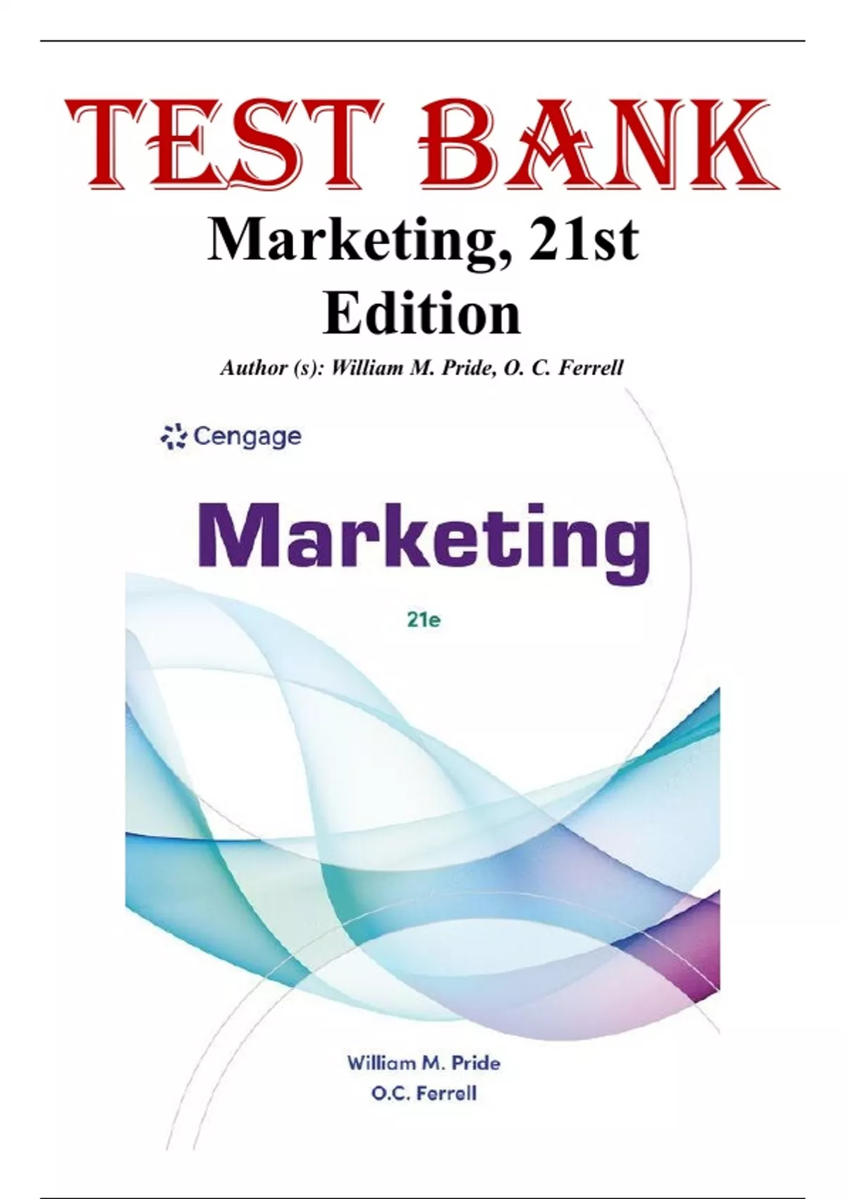 Test Bank for Marketing, 21st Edition by William M. Pride.Part I: MARKETING STRATEGY AND CUSTOMER RELATIONSHIPS. 1. An Overview of Strategic Marketing. 2. Planning, Implementing, and Evaluating Marketing Strategies. Part II: ENVIRONMENTAL FORCES AND SOCIAL AND ETHICAL RESPONSIBILITIES. 3. The Marketing Environment. 4. Social Responsibility and Ethics in Marketing. Part III: MARKETING RESEARCH AND TARGET MARKET ANALYSIS. 5. Marketing Research and Information Systems. 6. Target Markets Segmentation and Evaluation. Part IV: BUYING BEHAVIOR, GLOBAL MARKETING, AND DIGITAL MARKETING. 7. Consumer Buying Behavior. 8. Business Markets and Buying Behavior. 9. Reaching Global Markets. 10. Digital Marketing and Social Networking. Part V: PRODUCT DECISIONS. 11. Product Concepts, Branding and Packaging. 12. Developing and Managing Products. 13. Services Marketing. Part VI: DISTRIBUTION DECISIONS. 14. Marketing Channels and Supply-Chain Management. 15. Retailing, Direct Marketing and Wholesaling. Part VII: PROMOTION DECISIONS. 16. Integrated Marketing Communications. 17. Advertising and Public Relations. 18. Personal Selling and Sales Promotion. Part VIII: PRICING DECISIONS. 19. Pricing Concepts. 20. Setting Prices.