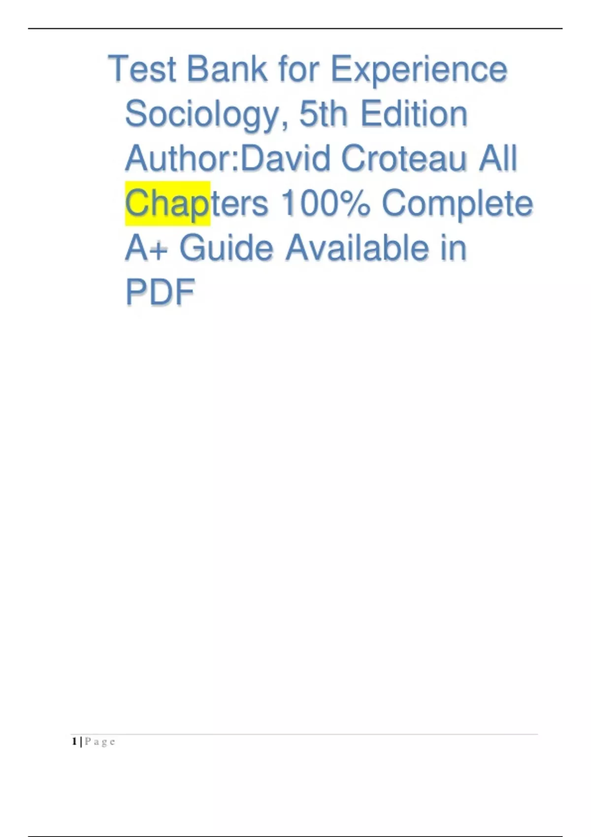 Test Bank for Experience Sociology, 5th Edition Author:David Croteau All Chapters 100% Complete A+ Guide Available in PDF