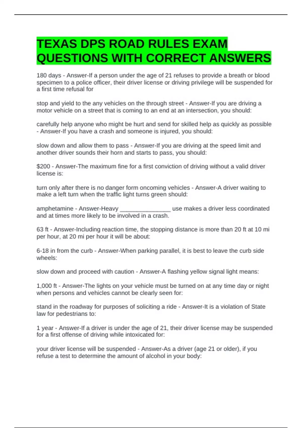 TEXAS DPS ROAD RULES EXAM QUESTIONS WITH CORRECT ANSWERS