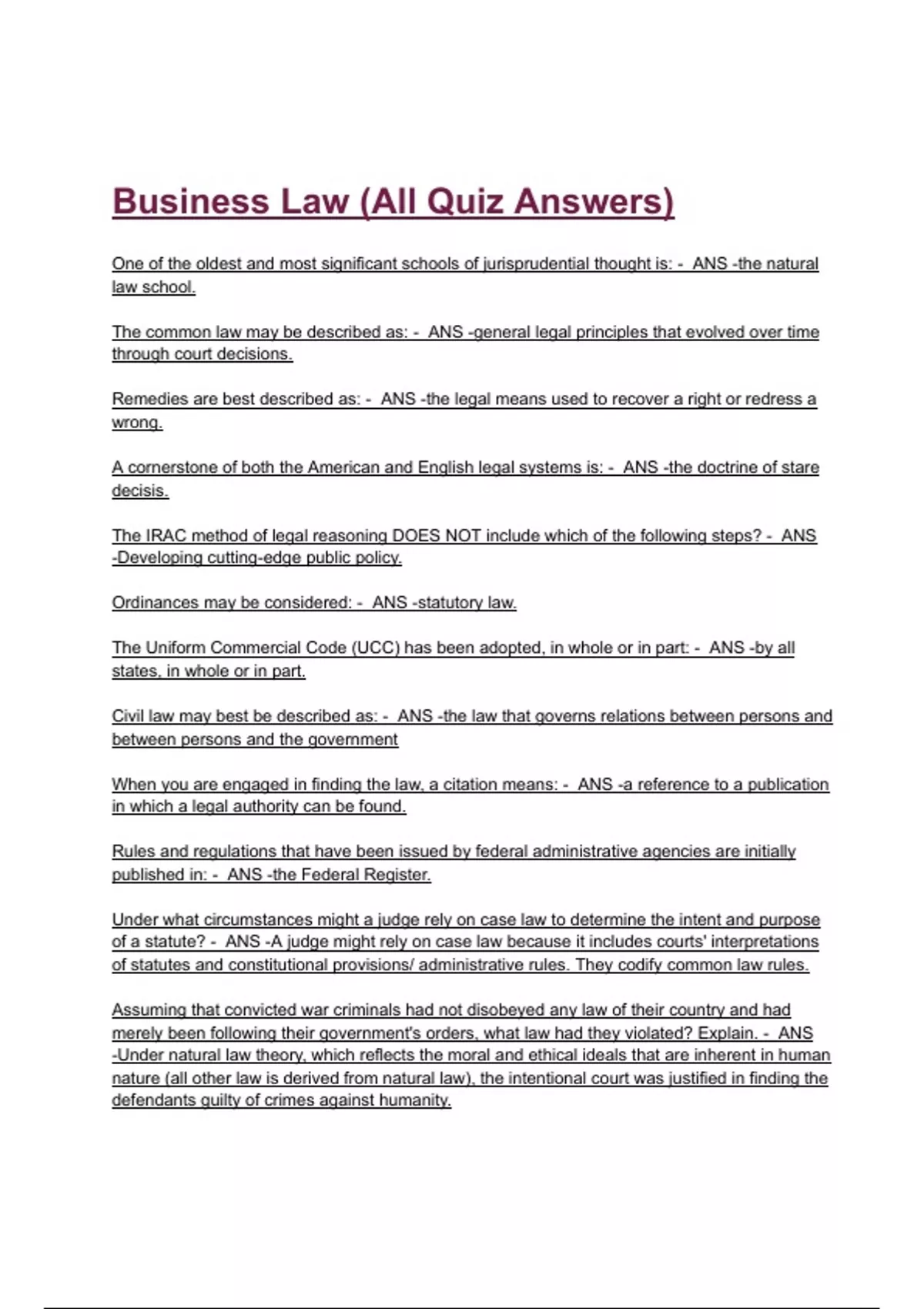 Business Law (All Quiz Answers)