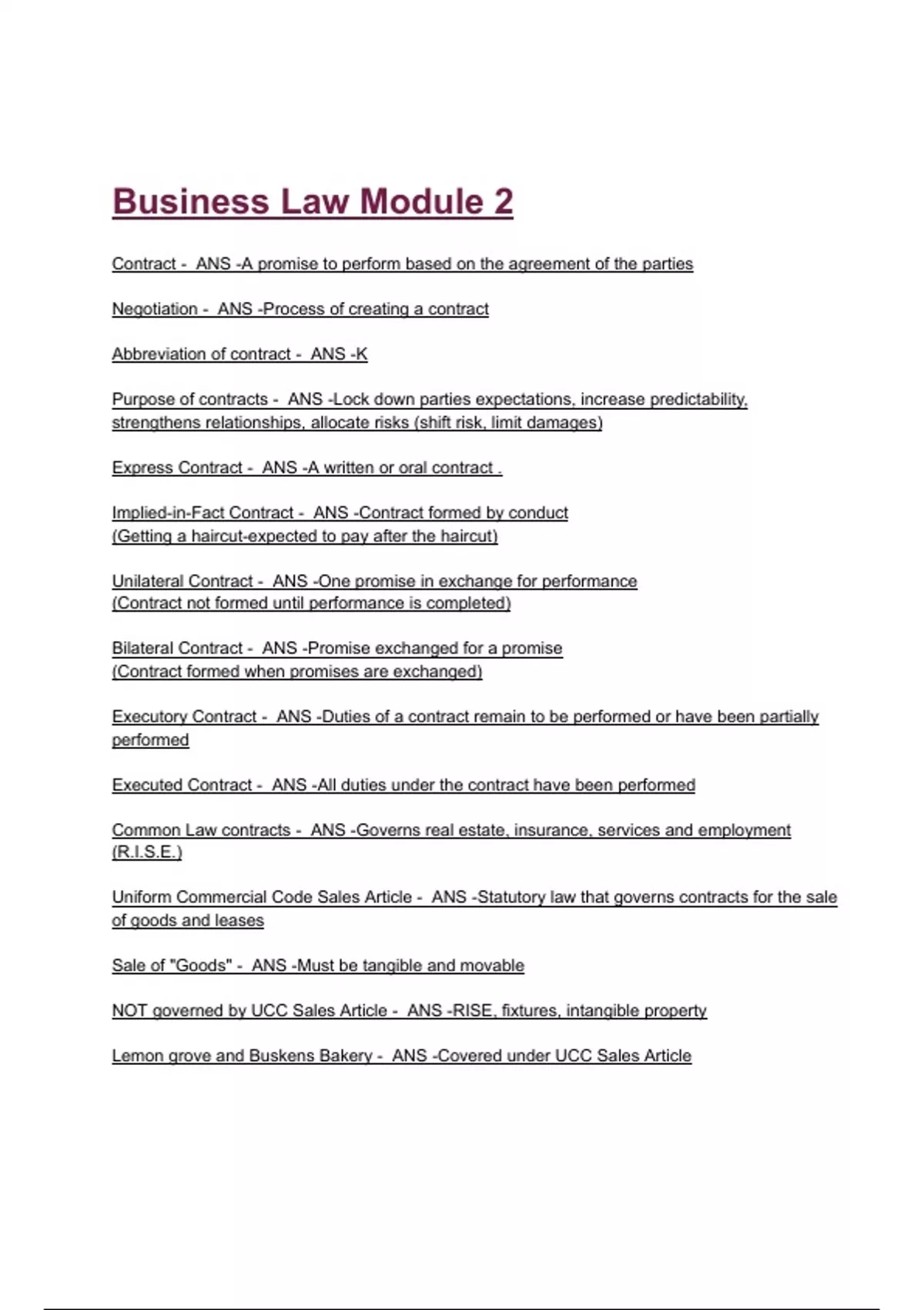 Contract - ANS -A promise to perform based on the agreement of the parties