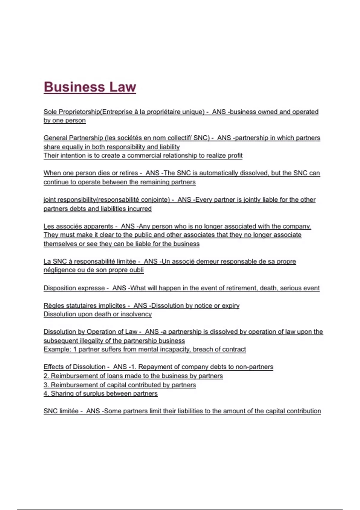 General Partnership (les sociétés en nom collectif/ SNC) - ANS -partnership in which partners