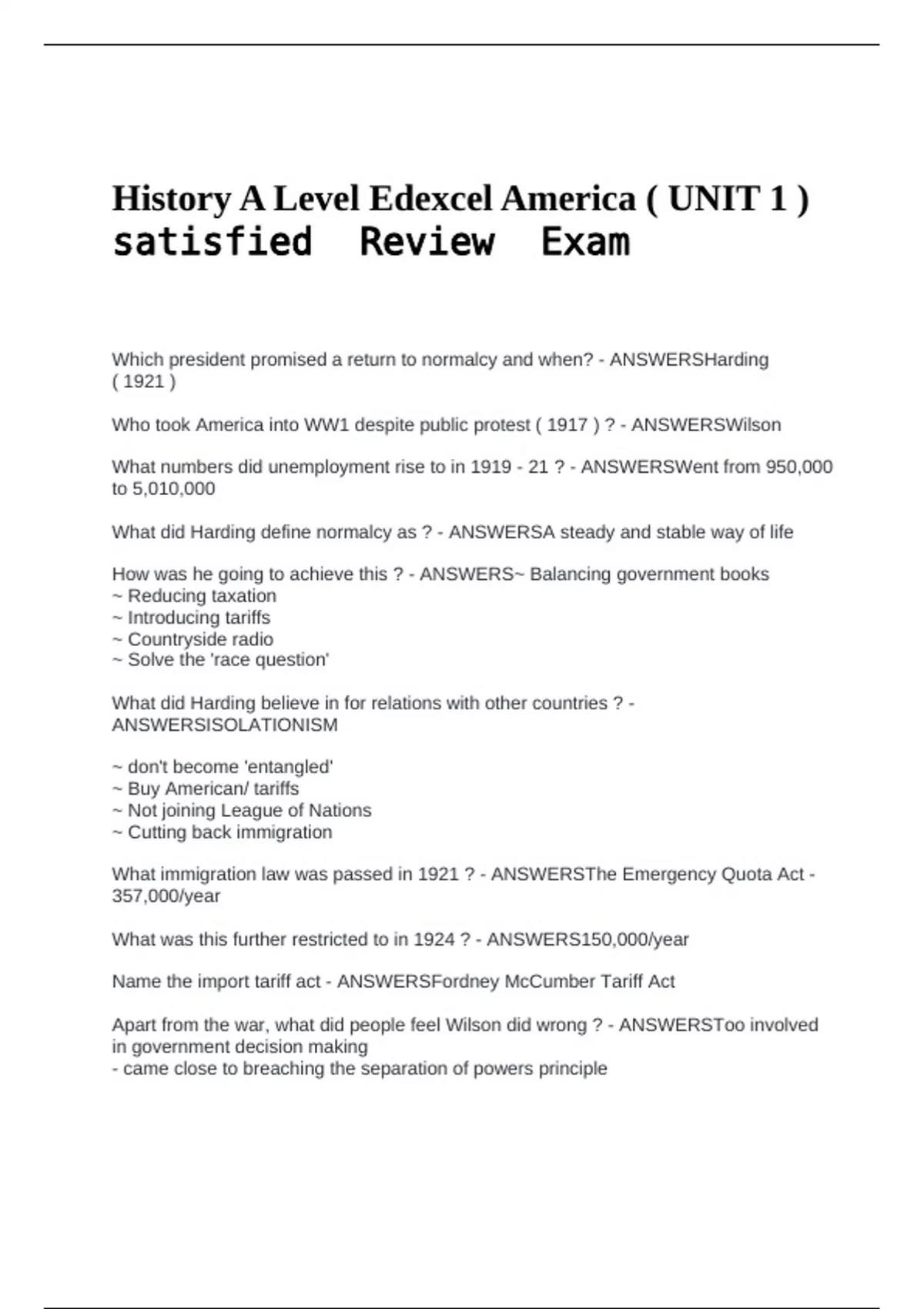 Which president promised a return to normalcy and when? - ANSWERSHarding ( 1921 ) Who took America into WW1 despite public protest ( 1917 ) ? - ANSWERSWilson What numbers did unemployment rise to in 1919 - 21 ? - ANSWERSWent from 950,000 to 5,010,000 What did Harding define normalcy as ? - ANSWERSA steady and stable way of life How was he going to achieve this ? - ANSWERS~ Balancing government books ~ Reducing taxation ~ Introducing tariffs ~ Countryside radio ~ Solve the 'race question' What did Harding believe in for relations with other countries ? - ANSWERSISOLATIONISM ~ don't become 'entangled' ~ Buy American/ tariffs ~ Not joining League of Nations ~ Cutting back immigration What immigration law was passed in 1921 ? - ANSWERSThe Emergency Quota Act - 357,000/year What was this further restricted to in 1924 ? - ANSWERS150,000/year Name the import tariff act - ANSWERSFordney McCumber Tariff Act Apart from the war, what did people feel Wilson did wrong ? - ANSWERSToo involved in government decision making - came close to breaching the separation of powers principle What was Harding's slogan ? - ANSWERS'Less government in business and more business in government' ~ Laissez Faire Why did the democrats not win the election/ who was Coolidge beforehand ? - ANSWERS- Democrats couldn't agree on a candidate - Coolidge was Harding's Vice President When was the first red scare ? - ANSWERS What communist event took place feb 1919 ? - ANSWERS- 3,600 strikes - Seattle shipyard worker strikes What was Hoovers new version of Laissez Faire ( 1929 ) ? - ANSWERSRugged individualism - people are weakened by the government so should receive more freedom What did Hoover set up with Congress after the Wall Street crash to help farms ? - ANSWERSFederal Farm Board What was set up in 1930 to help the unemployed ? - ANSWERSPresidents Emergency Committee for Employment What was the Bonus Army ( 1924 ) ? - ANSWERSGovernment gave payments to war vets but then couldn't afford to pay them What happened to them in 1932 ? - ANSWERSJuly 28th ~ 200,000 March on Washington broken up by troops with tear gas >Caused loss of support for Hoover What was FDR's campaign song 1932 ? - ANSWERSHappy days are here again How many voters were there 1932 ? - ANSWERS40 million (most ever) How many states did Hoover win ? - ANSWERSOnly 6 Name 2 New Deal alphabet agencies - ANSWERS- NRA ~ National Recovery Admin (work hours and minimum wage) - AAA ~ Agricultural Adjustment Agency (regulated crop production) When and what was FDR's inaugural speech ? - ANSWERS4th March 1933 - 'only thing we have to fear is fear itself' What were FDR's radio broadcasts called ? - ANSWERSFireside chats How many terms did FDR serve ? - ANSWERS4 terms (16 years) (unusual) How did FDR change the nature of the presidency ? - ANSWERSHe expanded the role of the President in managing the economy and His mastery of the radio affected the style of the President - more federal boards/committees When / what was the WW2 Land Lease Act ? - ANSWERSMarch 1941 - gave Britain supplies they couldn't afford whilst still remaining 'neutral' When did the USA enter WW2 ? - ANSWERS8th December 1941 - pear harbour bombing ~industry rose ~unemployment down When was the 2nd red scare ? - ANSWERS1947-54 When / what was HUAC and Loyalty boards ? - ANSWERS1938- House UnAmerican Commission - investigated 'un-American' activities Name two people prosecuted by HUAC - ANSWERSElizabeth Bentley Whittaker Chambers Who headed the second red scare ( 1950-54 ) ? - ANSWERSSenator Joseph McCarthy - 'the only good communist is a dead one' When and what was the SDS ? - ANSWERS1960- Student Democratic Society - Violent protest against bigotry When and what was the National Security Act ? - ANSWERS1947 - Cold War -Set up CIA and NSC